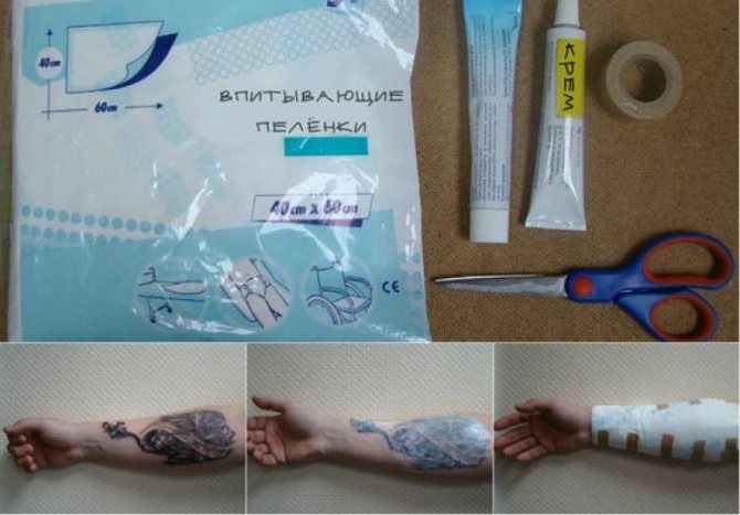 Пелените за еднократна употреба се предлагат във всеки магазин за бебешки стоки. Не е задължително да търсите продукти на големи марки. Съставът на всички пелени е приблизително еднакъв. Целта на пелената е да предотврати попадането на влага, прах и мръсотия върху незаздравялата татуировка. За разлика от фолиото, пелената не пречи на кожата да диша и затова тя не се изпотява. Освен това материалът абсорбира излишните пигментни частици.