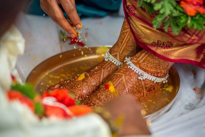 Ритуалът по нанасяне на мехенди върху индийската булка е особено характерен. Шаферките и най-близките им роднини се събират на кукерско парти, запалват пръчици агарбати, рецитират мантри и с часове рисуват ръцете и краката на булката, като призовават щастие в брака, вярност към съпруга, много деца и допълнителни съвети.