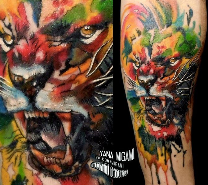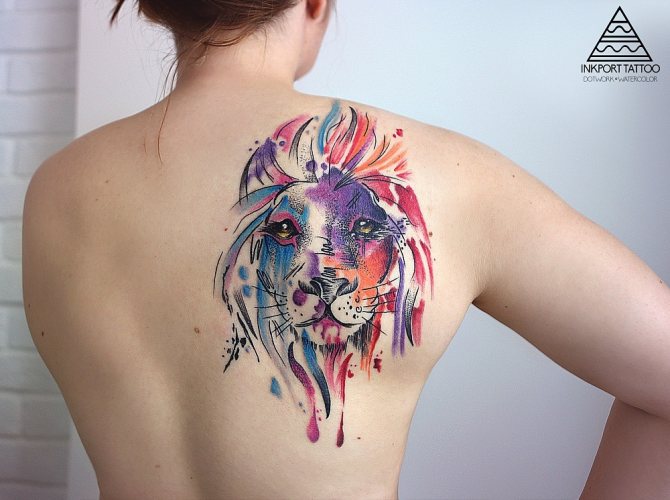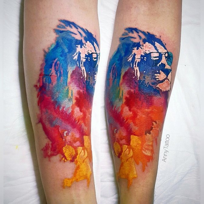 Много често при съвременните хора може да се види цветна татуировка с лъв, изпълнена в акварелна версия. Този стил е предпочитан от строго индивидуални и ярки личности. Но цветната татуировка на царя на животните в карикатурен формат е особено екстравагантна. Геометричните татуировки обикновено се правят с черно мастило, но цветен лъв с много линии изглежда много по-забележително.