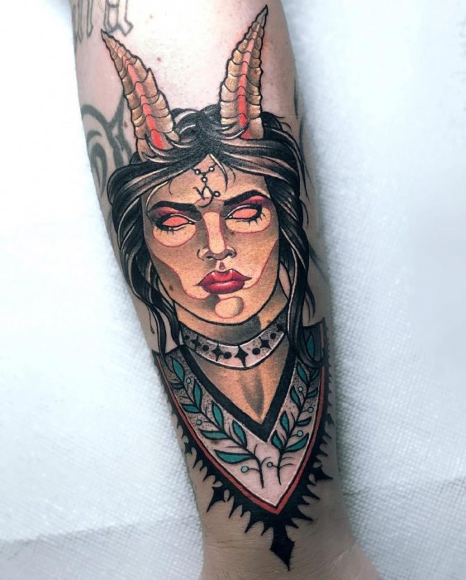 Ако решите да се върнете към произхода на символа на Козирога (древногръцкия бог Пан), добра идея е да изберете стил като Neo-Tradition. Този стил се характеризира с ярка композиция, ясни, дори педантични детайли на картината, "свежи" образи, сложна игра на цветовете (която прави неотрадицията да изглежда подобна на реализма) и триизмерно представяне на детайлите. Всички тези характеристики на този стил не биха могли да бъдат по-добри, за да подчертаят нетрадиционния външен вид на Козирога в образа на буйния и весел бог Пан.