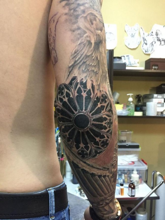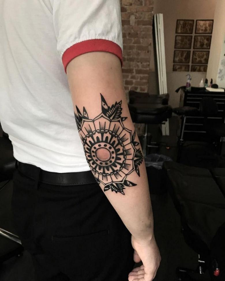Do této oblasti neumisťujte složité obrázky, portréty, zvířata, ptáky nebo ikony. Nejlépe jednoduché symboly a ornamenty. Například kompozice geometrických tvarů, správně složená na ruce, bude vypadat nejen originálně, ale také velmi stylově.