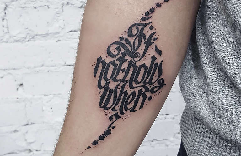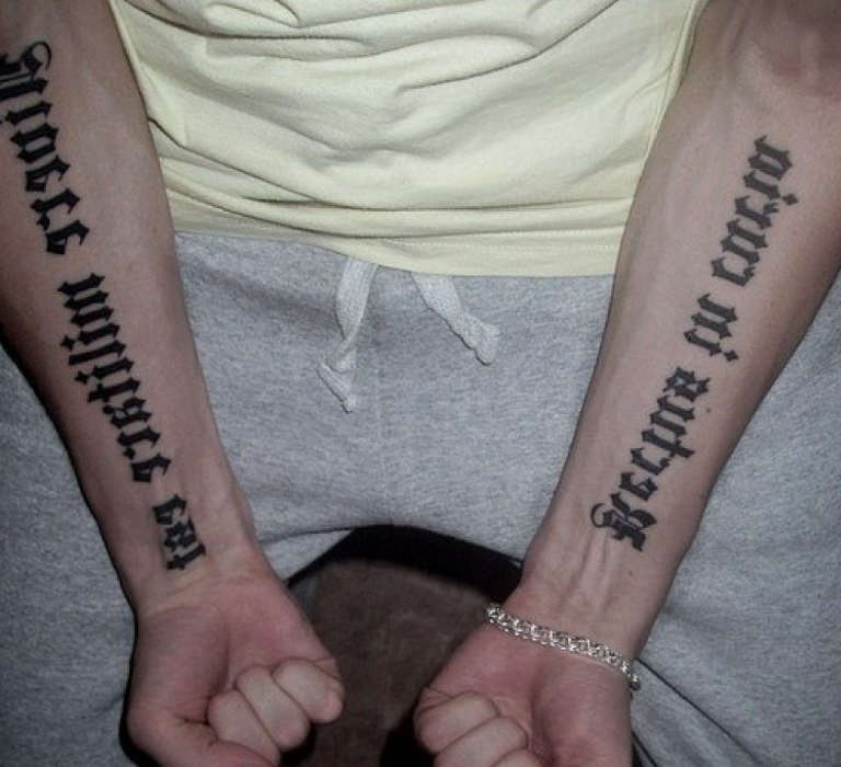 Nápisy -. cool tetování nemusí být vždy velké a složité, jeden nápis v originálním designu může zastínit jiné populární vzory. Nápis může odkazovat na osobní informace ze života nebo může být citátem, aforismem či úryvkem z literatury.