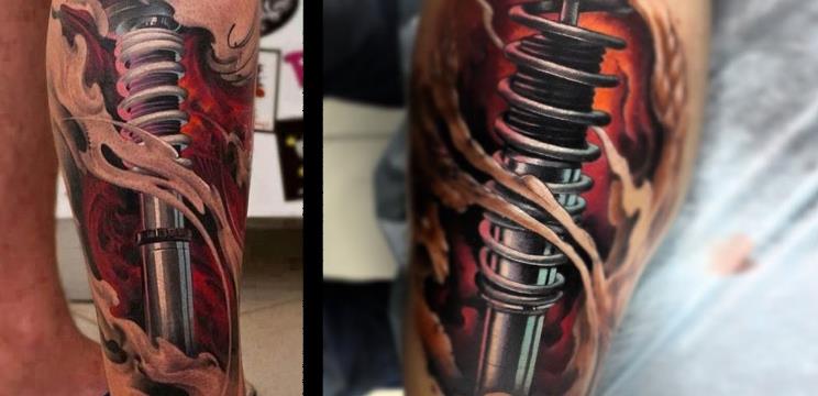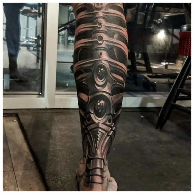 Stylový vzhled biomechaniky na noze. Existují zde však určité rozdíly podle pohlaví. Dívky si většinou nechávají tetovat stehna ve stylu mechaniků, zatímco kluci si nechávají tetovat holeně. U mužů je preferována drsnější verze biomechaniky: více mikročipů a detailní kresba svalů.