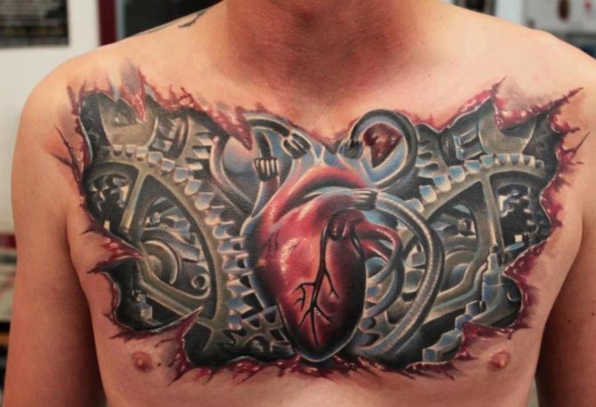 Biomechanické tetování na hrudi upřednostňují muži, kteří chtějí skrýt design před zvědavýma očima. Nejčastěji může tato touha souviset s profesní sférou. Chlapci mají na hrudi zpravidla vyobrazeno srdce pracující na strojích. Dalším oblíbeným vzorem je srdeční sval pod zámkem a obklopený kovovými prvky. Význam tohoto tetování symbolizuje smutné rozloučení a ztrátu víry v lásku.
