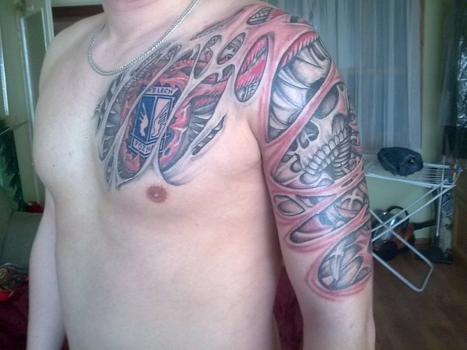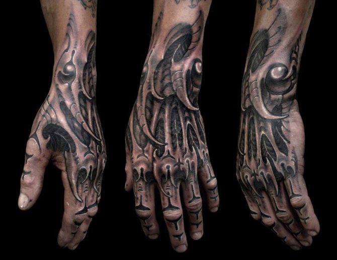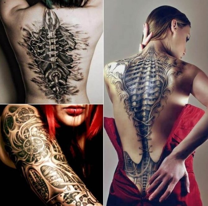 Tetování v biomechanickém stylu zahrnuje kresbu na exponovaných částech těla: krk, rameno, předloktí a dolní část nohy.