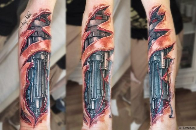 Nejznámější biomechanická tetování vypadají takto: skrze potrhanou kůži jsou vidět různá ozubená kola, páky, trubky, tyče a další mechanické předměty.