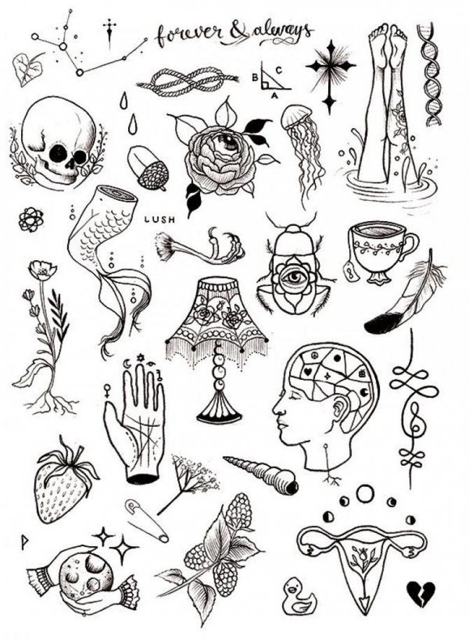 Tetování tohoto typu je sice jednoduché, ale jeho nositel se nemusí rozhodnout pro konkrétní motiv. Tetování této povahy, ačkoli jsou jednoduchá, nezavazují své budoucí majitele k tomu, aby se rozhodli pro vzory s určitým tématem. Mezi možné varianty patří četné obrazy zvířat, květinové motivy, různé amulety, znamení, symboly, geometrické vzory, znamení zvěrokruhu a mnoho dalších nápadů. Hlavním rysem tohoto druhu tělových šperků je jejich jedinečná schopnost vypadat roztomile a originálně v jakémkoli provedení. V závislosti na vašich preferencích se tedy může jednat buď o kresbu, která je obrysová, obkreslená jemnou linkou, nebo o barevné, detailní obkreslené obrázky.