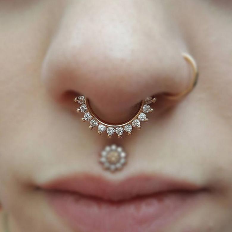 U žen se za nejlepší místa pro šperky považují křídla a špička nosu. Šperky ze zlata s přídavkem drahých a polodrahokamů budou vypadat roztomile a dodají rysům obličeje exotický nádech.