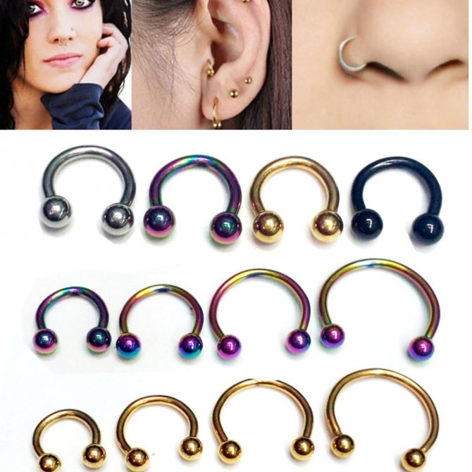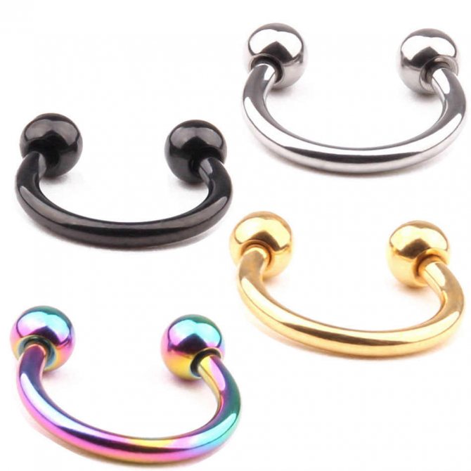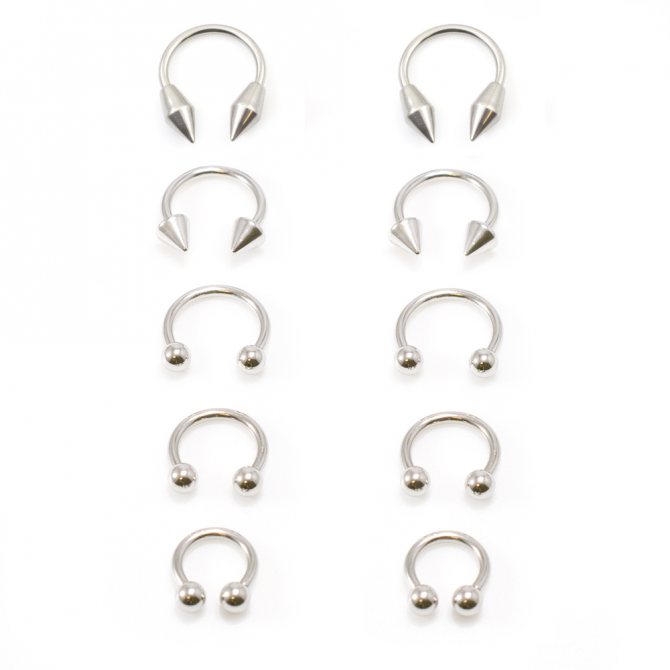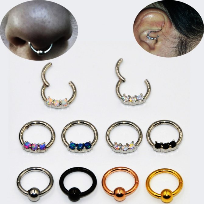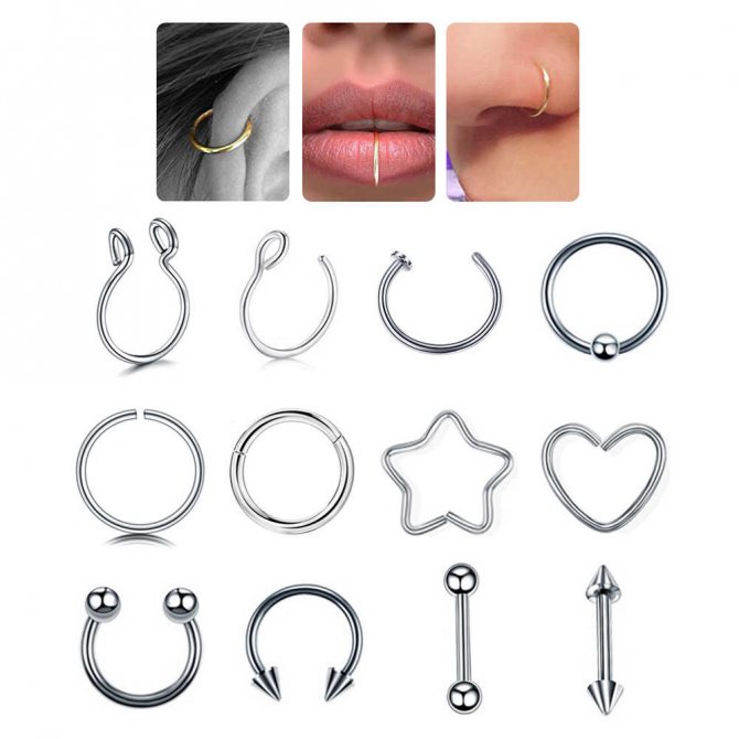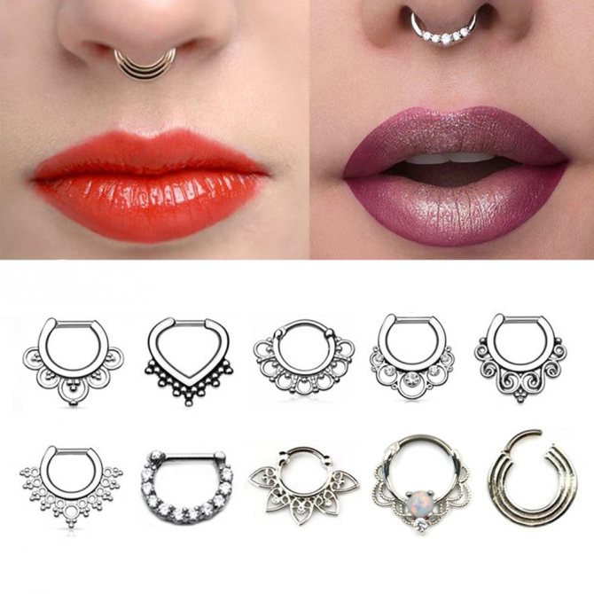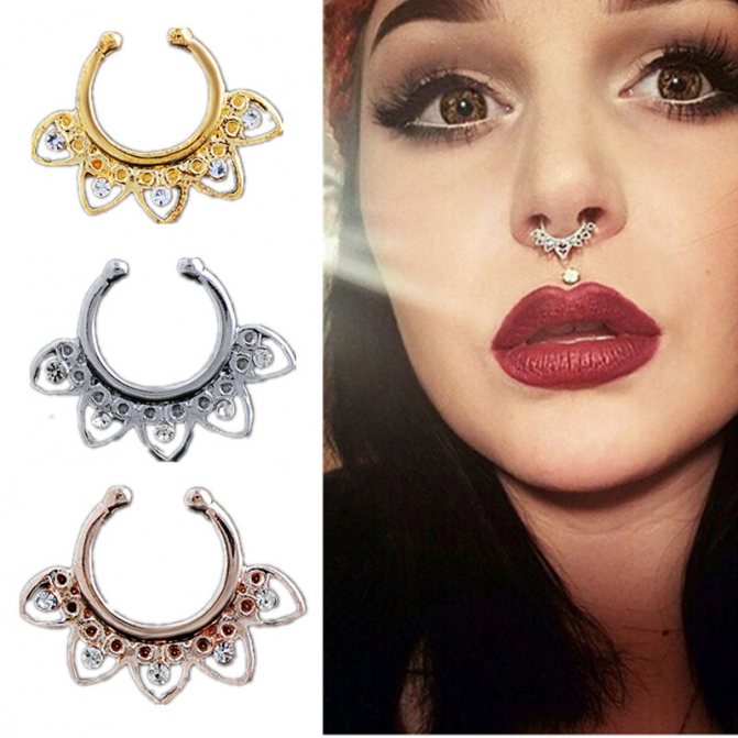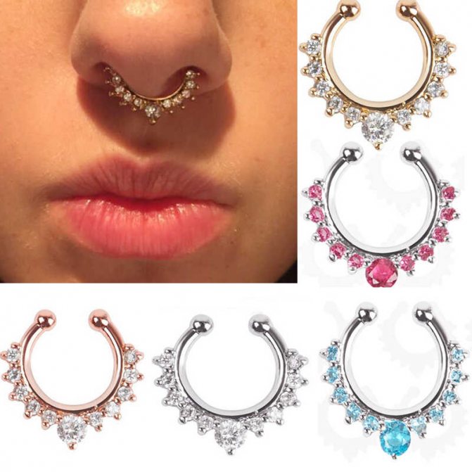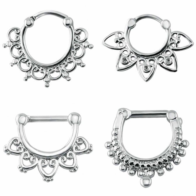 kroužek, činka, kruhový, plastová sponka. Při prvním vpichu odborníci nasadí speciální akrylovou nebo titanovou sponku ve tvaru písmene "C". Přepážka je aktivní reflexní oblastí a jakýkoli kontakt s tyčí nebo kroužkem vyvolává silný pocit "škrábání". Lehká plastová svorka, jejíž konce směřují podél nosní přepážky, nepřekáží při oblékání a zabraňuje komplikacím při tvorbě kanálu.