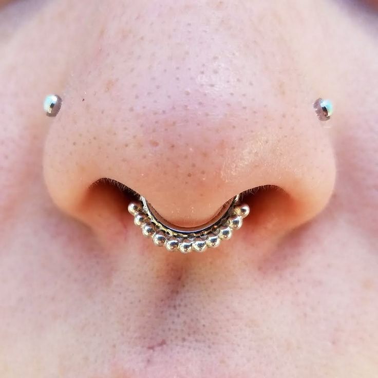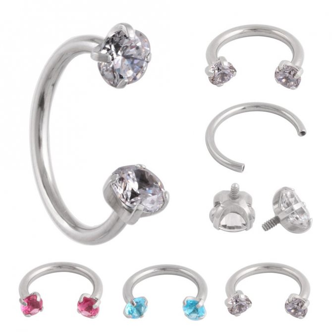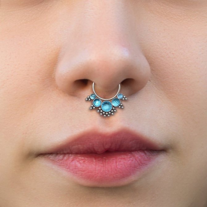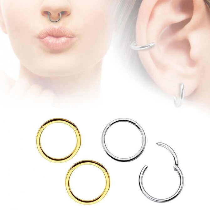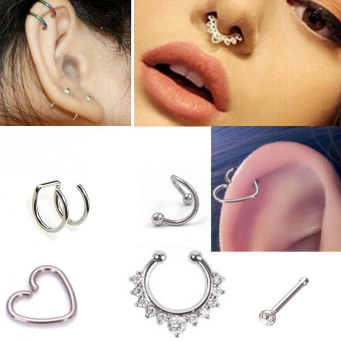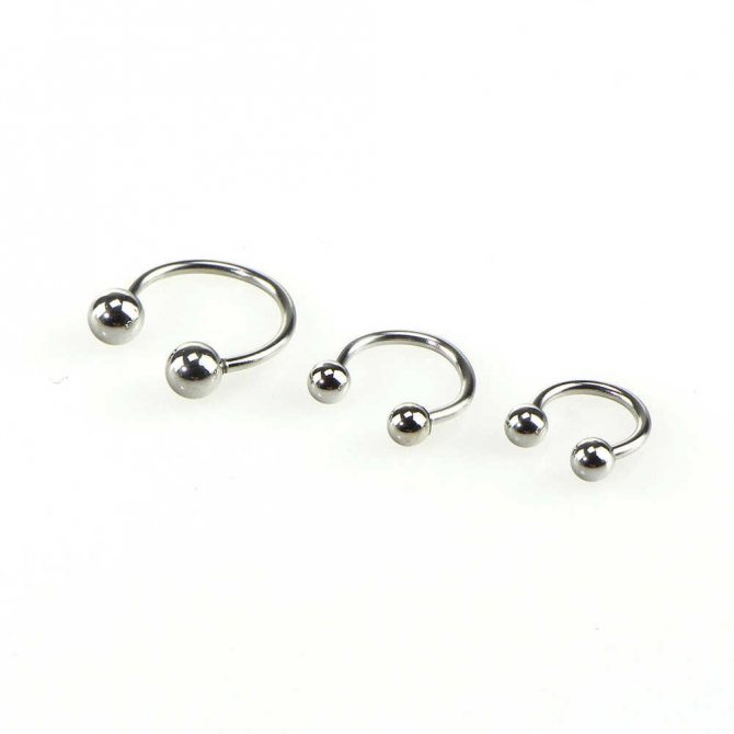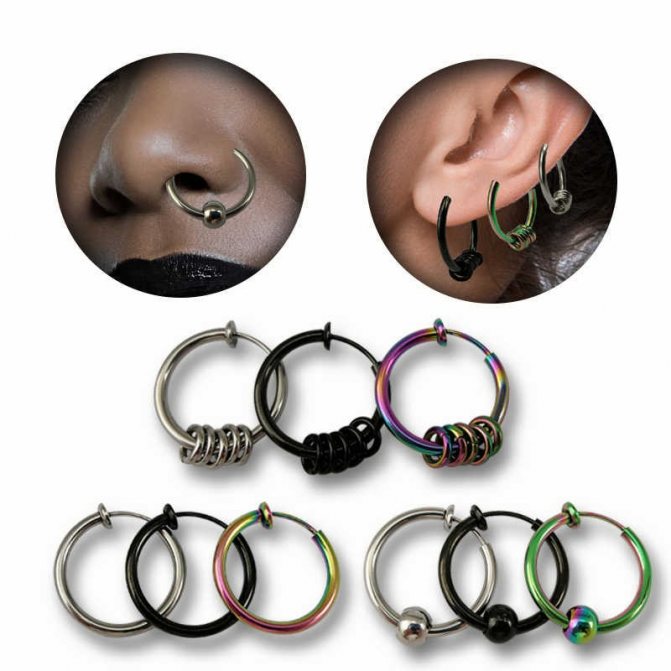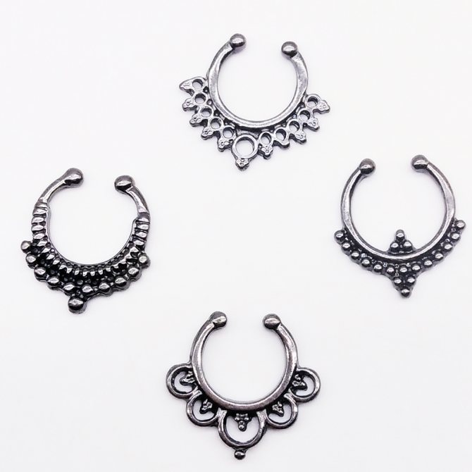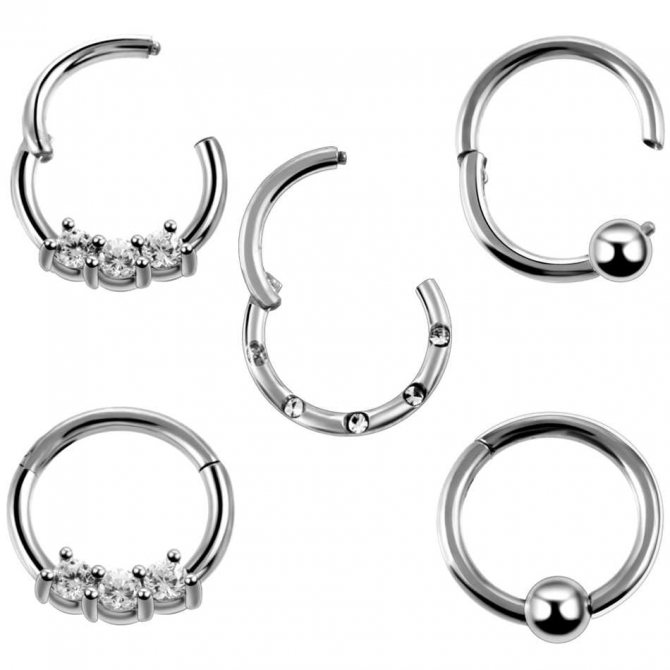 kroužek, činka, kruhový, plastová sponka. Při prvním vpichu odborníci nasadí speciální akrylovou nebo titanovou sponku ve tvaru písmene "C". Přepážka je aktivní reflexní oblastí a jakýkoli kontakt s tyčí nebo kroužkem vyvolává silný pocit "škrábání". Lehká plastová svorka, jejíž konce směřují podél nosní přepážky, nepřekáží při oblékání a zabraňuje komplikacím při tvorbě kanálu.
