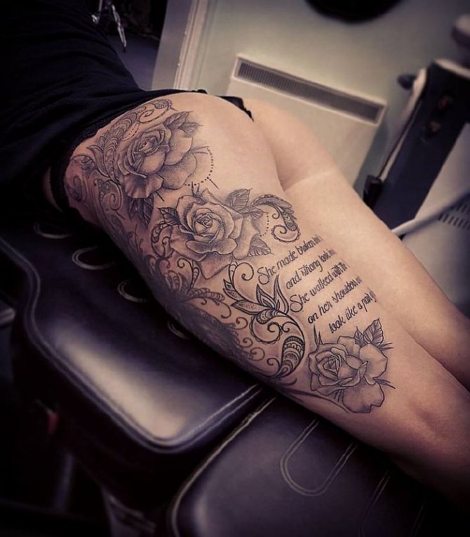 Krásná tetování na stehně se aplikují během několika hodin, protože mají velkou plochu. Mistři si všímají relativní bezbolestnosti sezení: stehno má silnou svalovou vrstvu a hustou tukovou vrstvu. Dívky mají tenčí a citlivější pokožku, a proto je pro muže tetování na straně stehna méně bolestivé.
