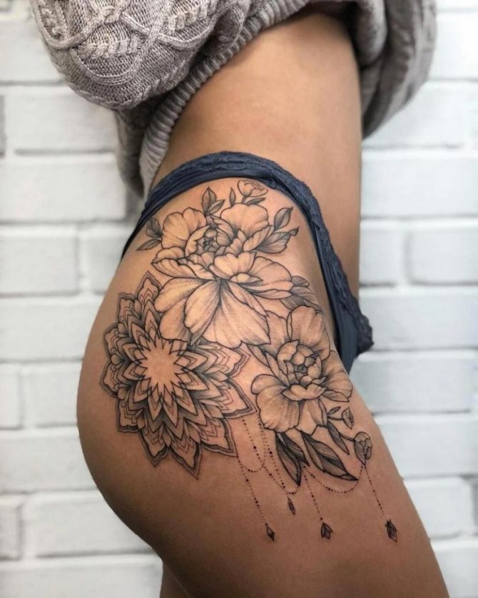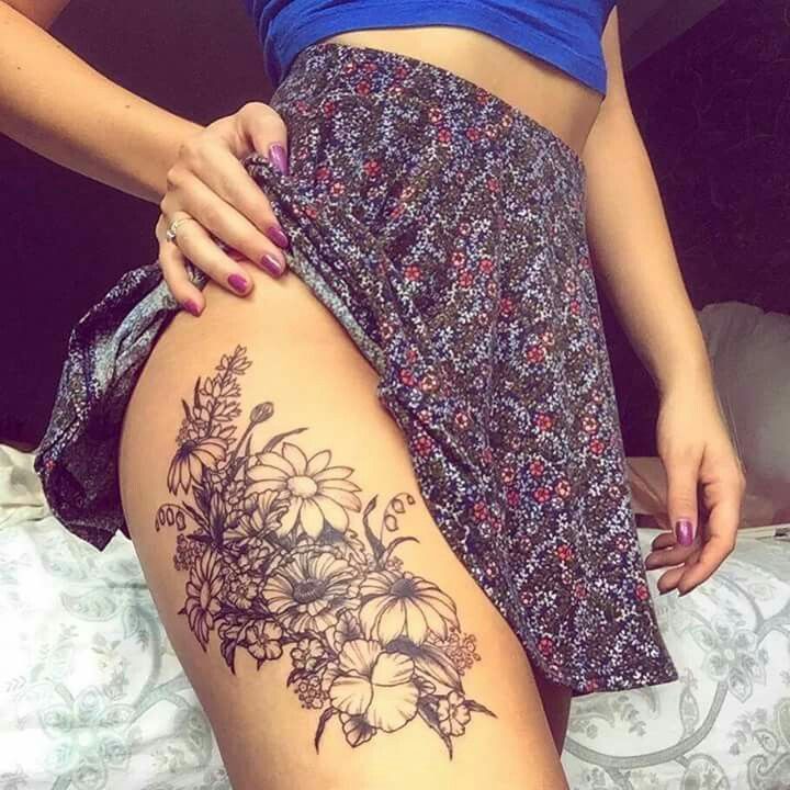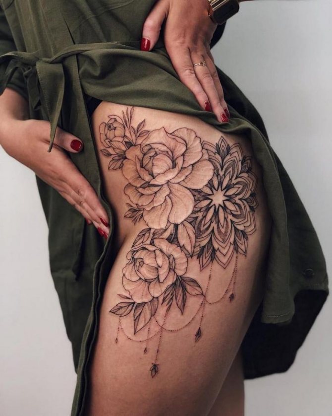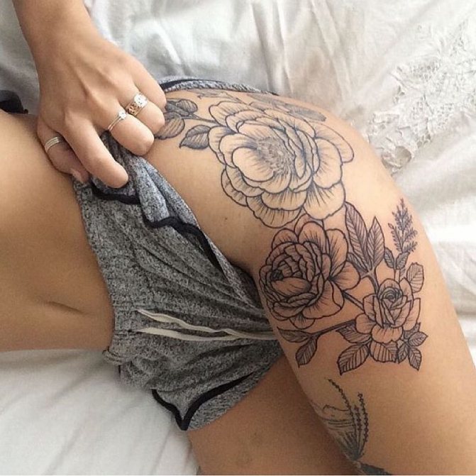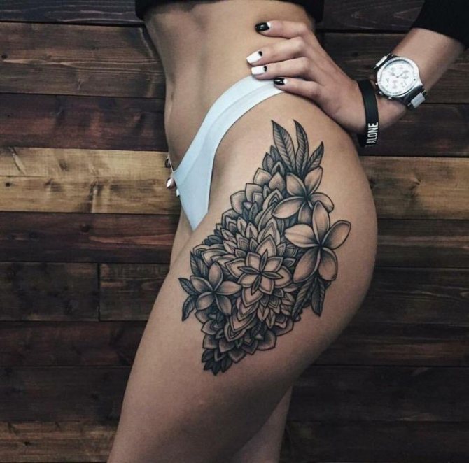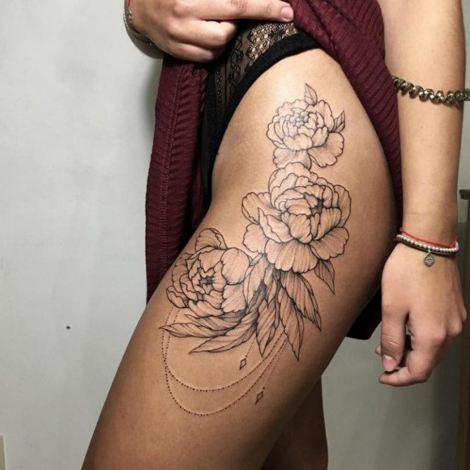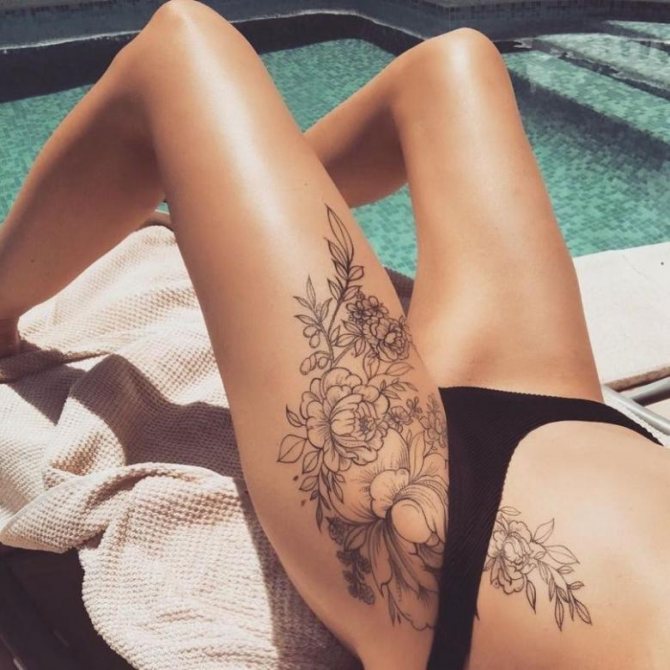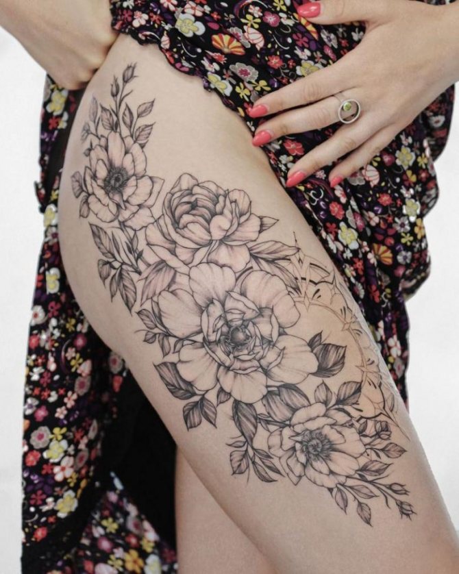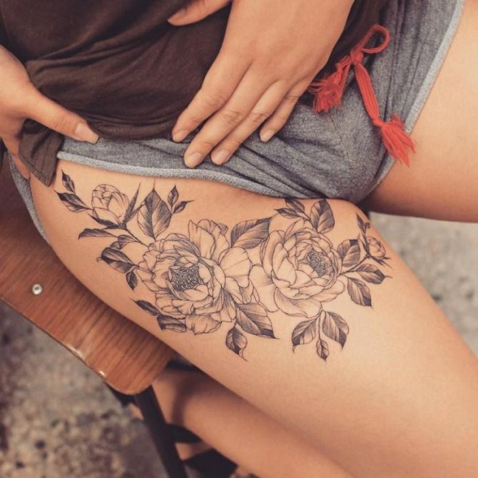 Kvetoucí větve nebo poupata na ženském stehně vypadají obzvlášť přitažlivě. Měly by být provedeny v růžových, modrých nebo šarlatových odstínech. Doporučujeme zvolit jemné úhledné linie, které zdůrazní křehkost květin.