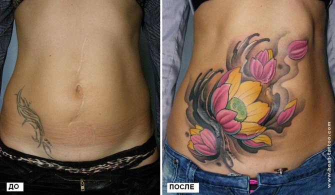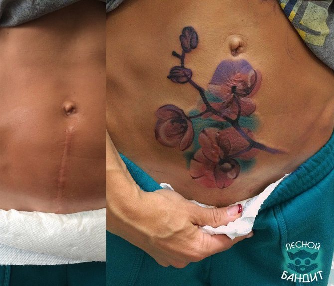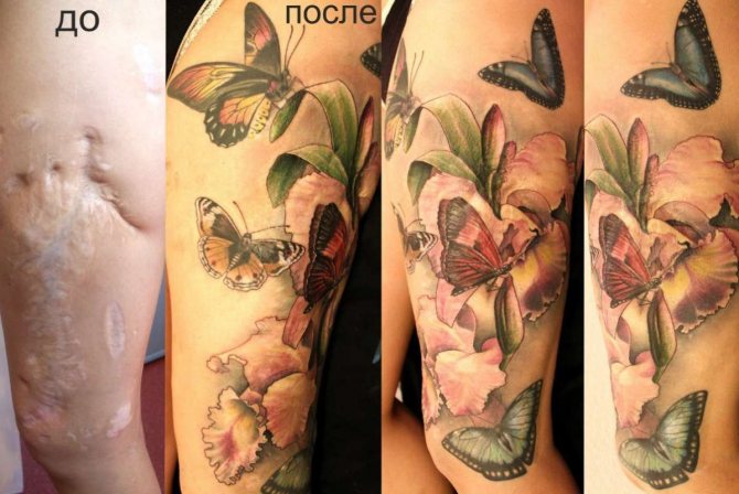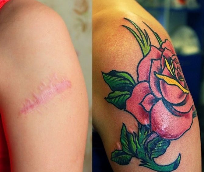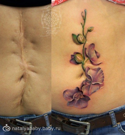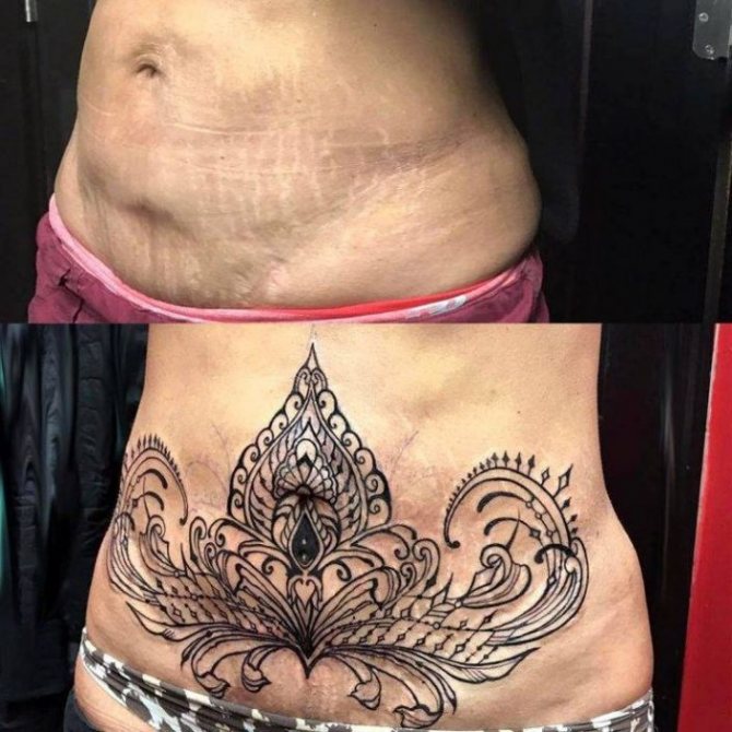 - Druhá možnost maskování - obvyklé barevné nebo černobílé tetování. V tomto případě je vzor zvolen tak, aby opticky vyhladil reliéf kůže a tón jizvy.