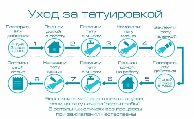 Správná péče zabraňuje infekcím během hojení a předčasnému vyblednutí inkoustu. Za tímto účelem stačí tetování první 2-3 dny nenamáčet. Jak je známo, oblast kůže s tetováním se ošetří antiseptikem a překryje se fólií, která by se po určitou dobu neměla odstraňovat. Tím se zabrání vniknutí bakterií.