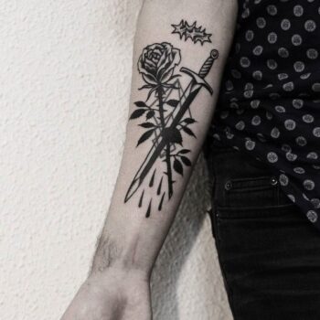 Tetování meče a růže je poměrně kontroverzní. Růže v takovém tetování naznačuje romantiku, smyslnost a zasněnost, zatímco čepel vypovídá o ochotě bránit se a útočit. Kombinaci těchto dvou prvků využívají lidé, kteří jsou v klidné situaci klidní a vyrovnaní, ale v případě potřeby jsou schopni projevit nebojácnost a rozhodnost.