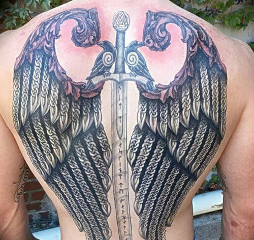Meč je zbraní bojovníků, symbolizuje ochranu sebe sama a své cti, křídla představují svobodu a let. Kombinace těchto dvou symbolů v tetování naznačuje, že nositel je sebevědomý člověk, je pro něj důležitý pojem spravedlnosti a férovosti a usiluje o duchovní rozvoj a osobní růst.