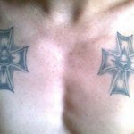 - S křížem. Kříž je prastarý magický symbol, o kterém jsme již psali. Můžete zobrazit Ježíše na kříži, a tím vyjádřit jeho úzkost a pokračovat v zármutku nad ním. Nebo můžete nakreslit kříž v blízkosti světce. Takové tetování by se vykládalo jako víra, nesmrtelnost, paměť.