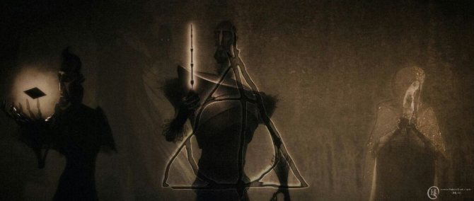 Trojúhelník je symbol pláště neviditelnosti, který je vyroben z pláště samotné smrti. Taková látka, která svého nositele skrývá jak před světem živých, tak před Smrtí.