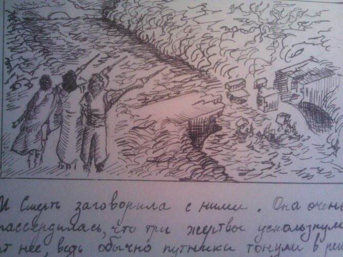 O půlnoci dorazili k jisté řece, kterou se jim podařilo překlenout díky jejich magickým schopnostem. Na tomto mostě se setkali se Smrtí (jako bytostí).