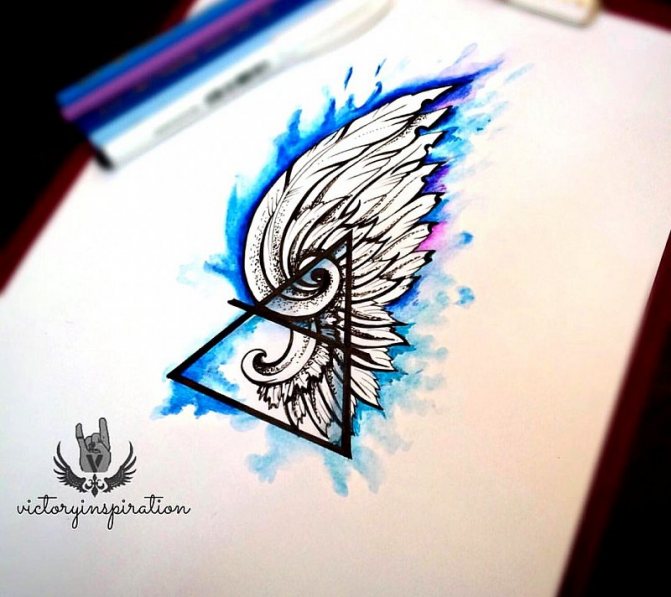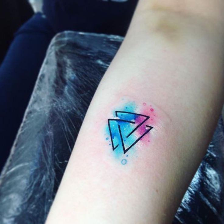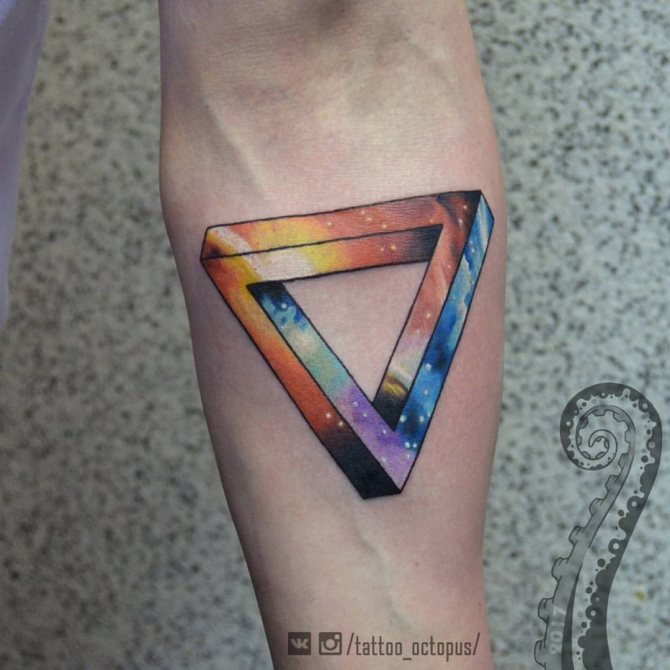 Většina příkladů trojúhelníkového tetování na paži je provedena barevným inkoustem. Zvláště efektivní na zápěstí vypadá trojúhelníkové tetování technikou akvarelu. Neobvyklý design horoskopu se hodí pro dívky, které se nenechají odradit životem a snaží se vše vidět skrze pestrobarevné prizma štěstí. Pokud mluvíme o černé verzi tetování na paži, trojúhelník v tomto formátu vypadá elegantně, což je v každém případě již považováno za módní.