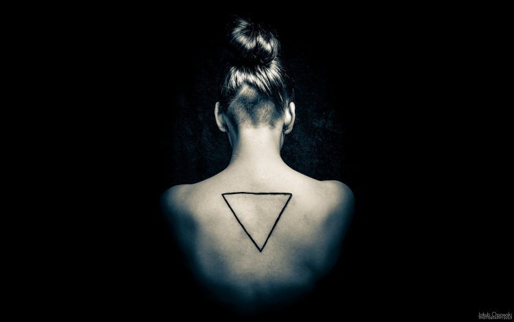- Vrchol směřující dolů je spojen s početím nového života, soukromím a diskrétností. Tetování symbolizuje ženskost a je znamením měsíce. Pro tento trojúhelník je vhodnější bílá barva.
