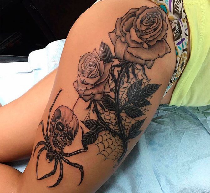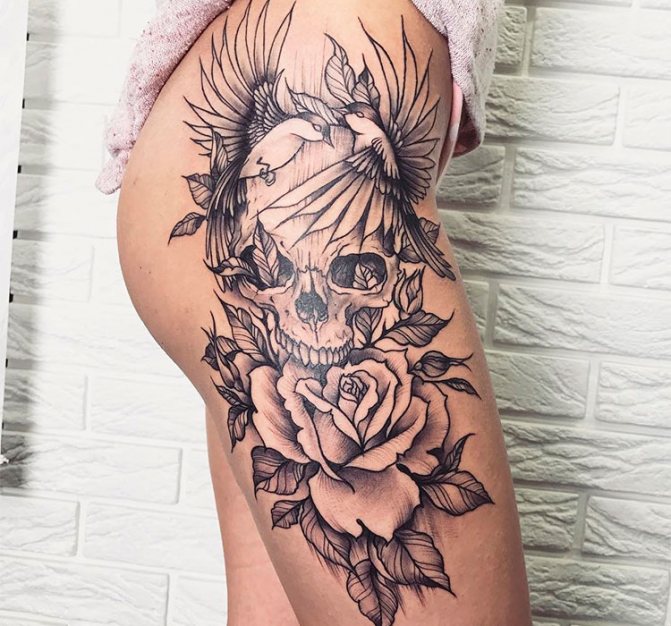 Může mít různé významy a závisí na celkovém designu tetování. Hlava kostlivce s květem růže vedle symbolizuje ztrátu, ztrátu milované osoby. Často je doplněn nápisem se jménem.