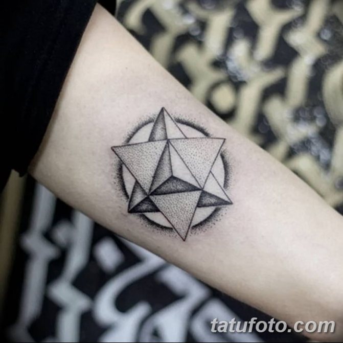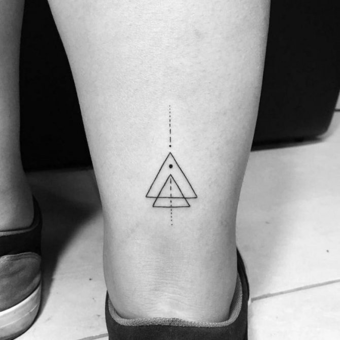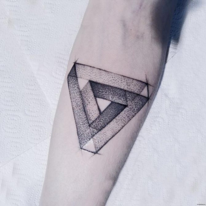 Tato geometrická figura je nakreslena abstraktním stylem v technikách minimalismu a grafiky. Trojúhelník je vyveden v lakonickém černobílém provedení a má poměrně malé měřítko. Proto je toto tetování častější na předloktí a zápěstí.