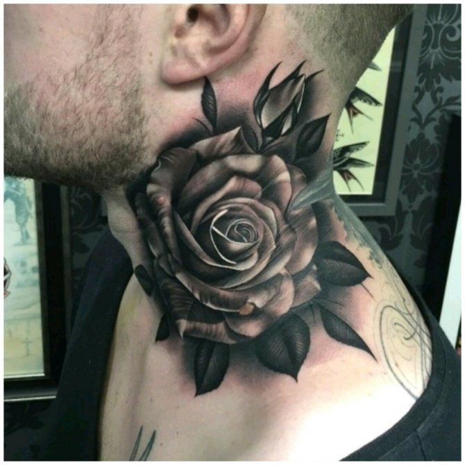 Tetování růže na krku muže znamená, že muž chce svému obrazu dodat tajemství. Toto tetování je intimní, protože muž by měl tetování zakrýt šátkem a nebude vidět.