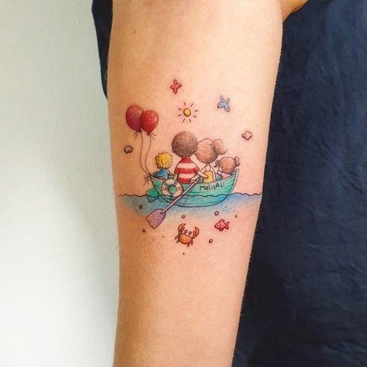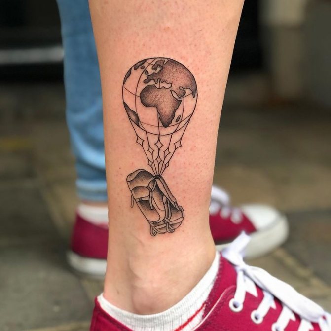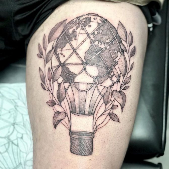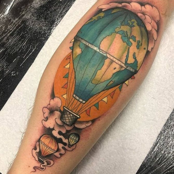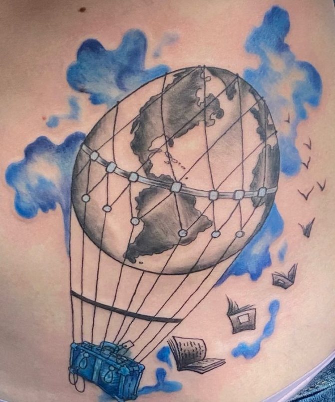 Čisté umění vyjádřené metamorfózou zeměkoule a balonu. Provázky balonu obepínajícího zeměkouli připomínají nakreslené rovnoběžky. Místo koše je často zobrazován turistický batoh nebo kufr. Je to další způsob, jak tetováním vyjádřit svůj zájem o cestování.