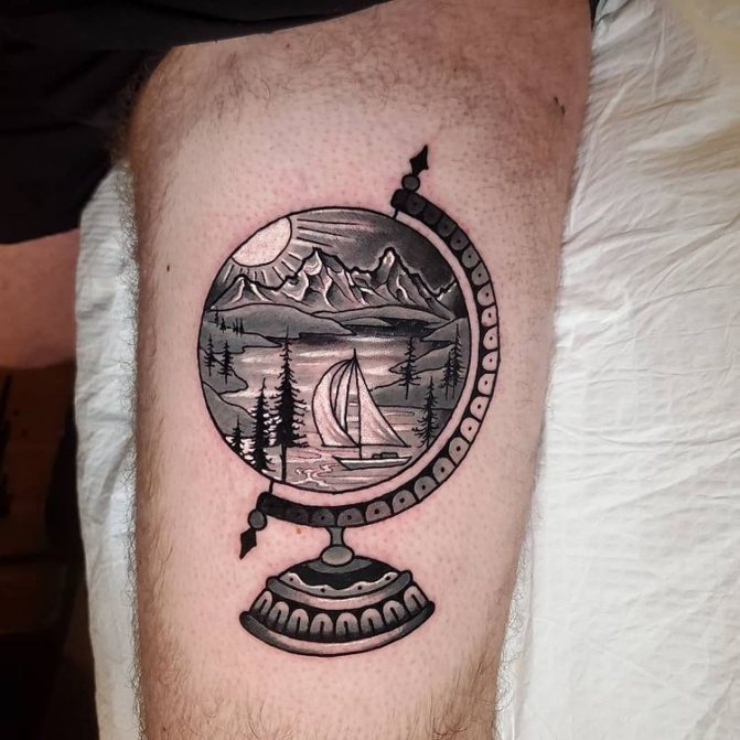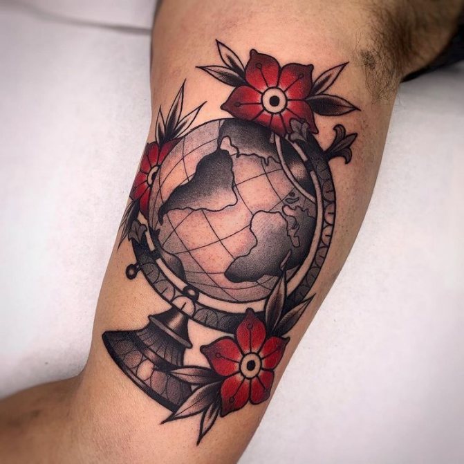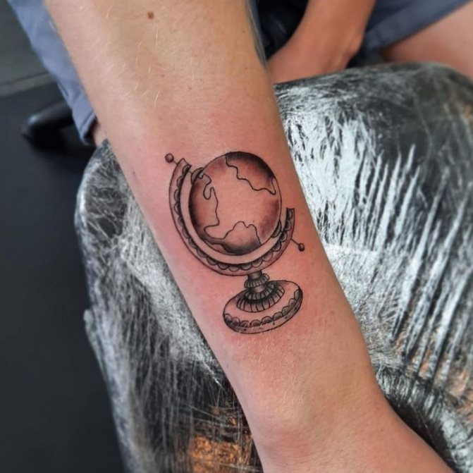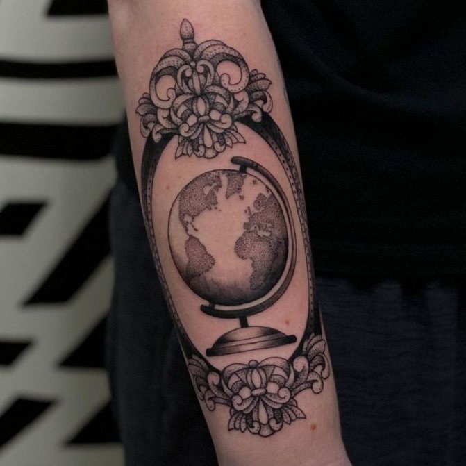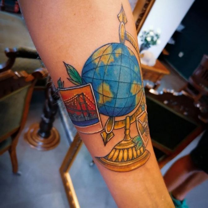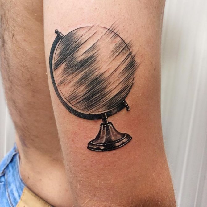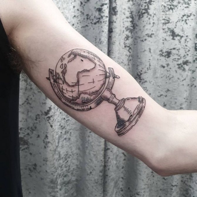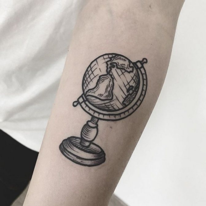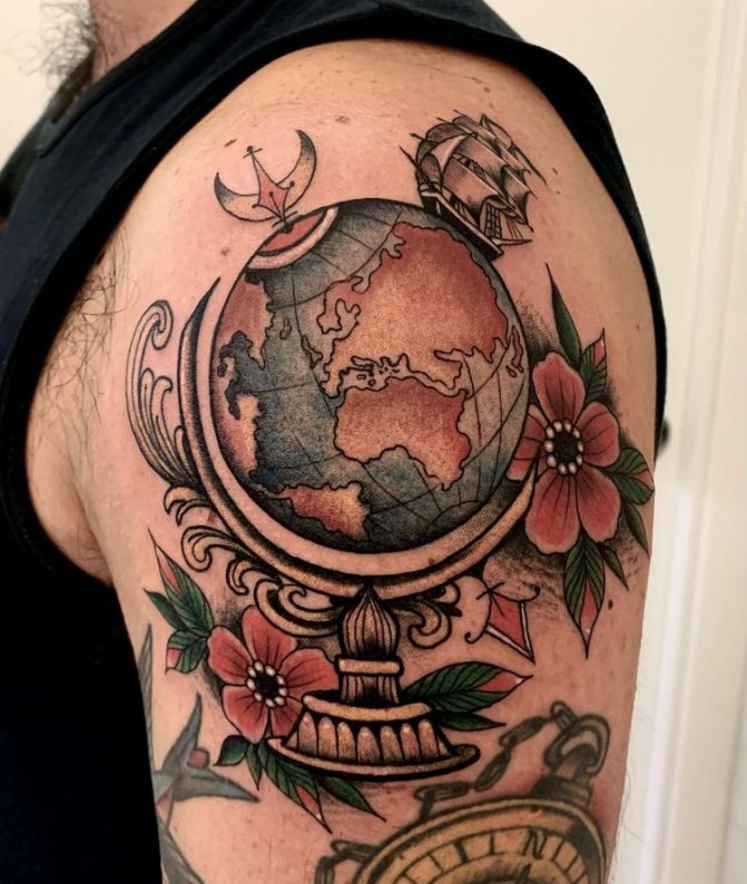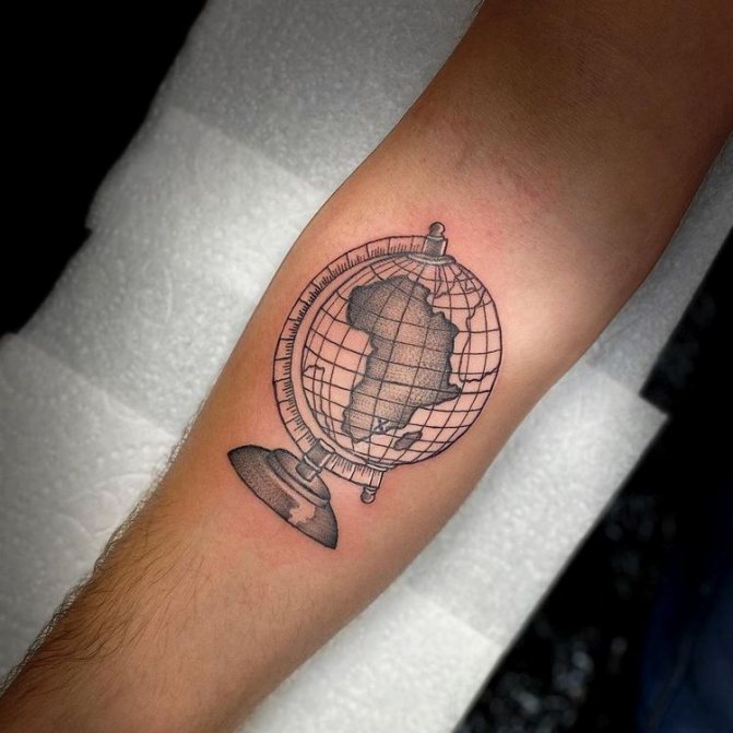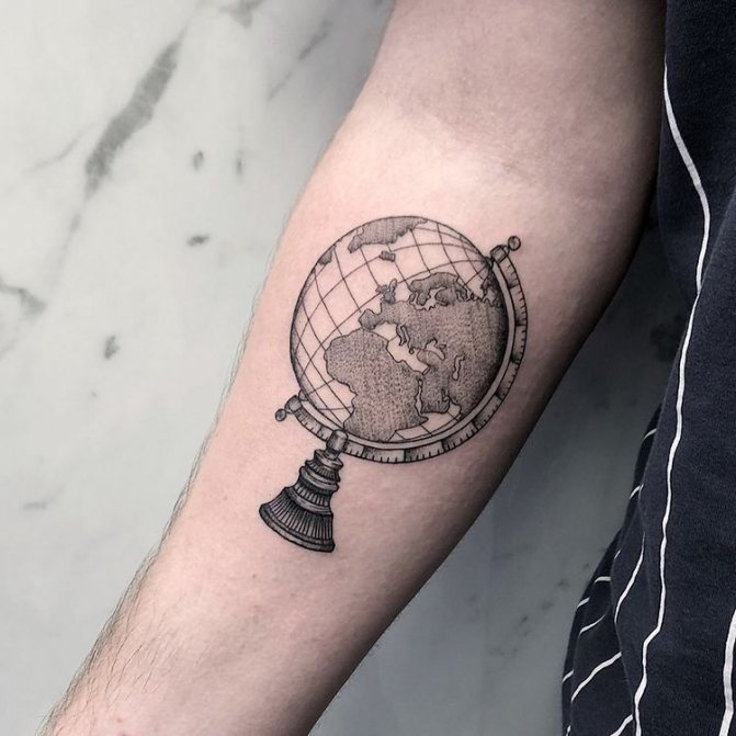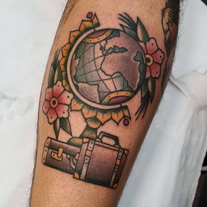 Obraz zeměkoule, stuha s mottem o lásce k cestování - znamení člověka milujícího svobodu, pro kterého nezáleží na ceně letenek a dostupnosti pohodlí na cestách. Hlavní věc pro majitele tetování - možnost vidět na vlastní oči legendární památky architektury a historie, exotické krajiny jiných zemí, úžasné krajiny vytvořené samotnou přírodou. Takoví muži získávají sílu a inspiraci z cestování, prožívají zážitky a uchovávají si krásné vzpomínky na každou cestu.