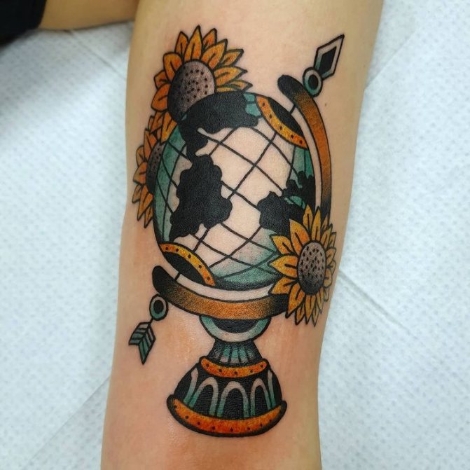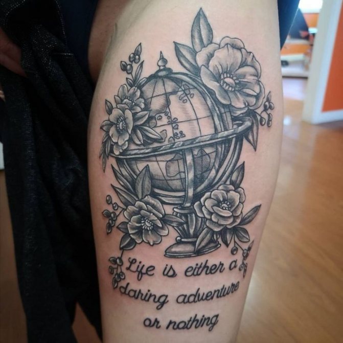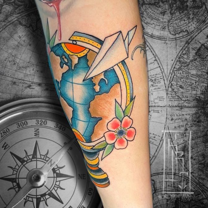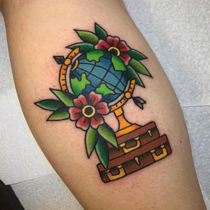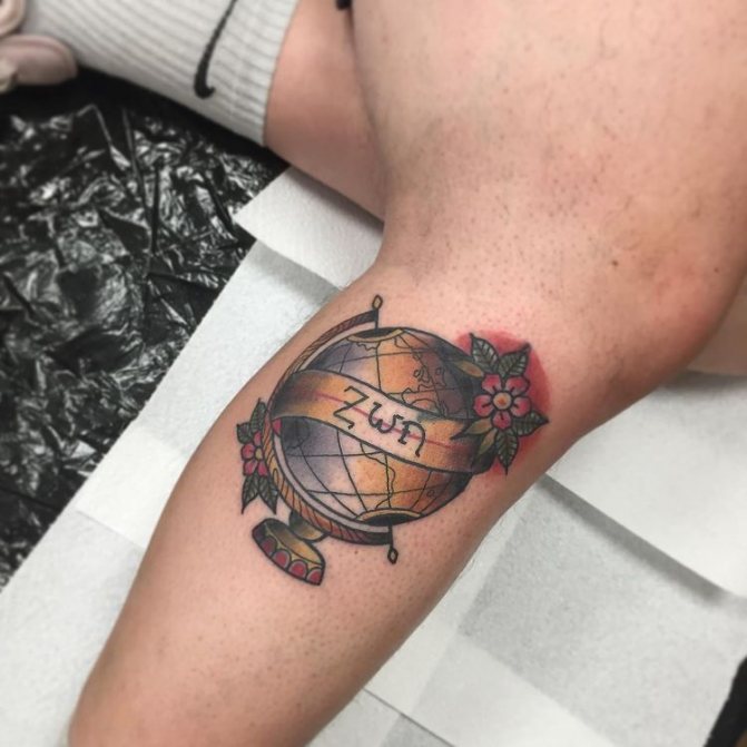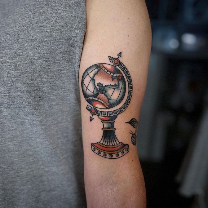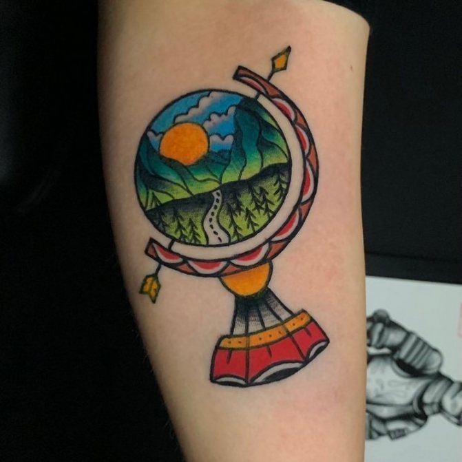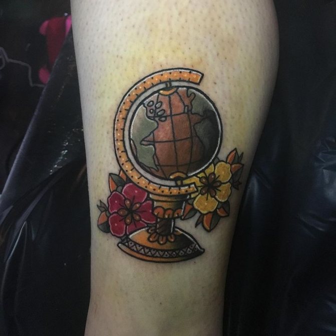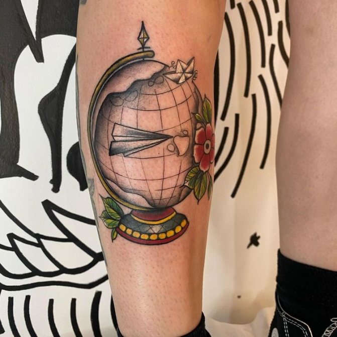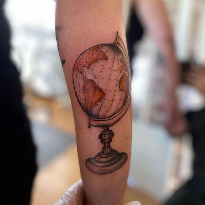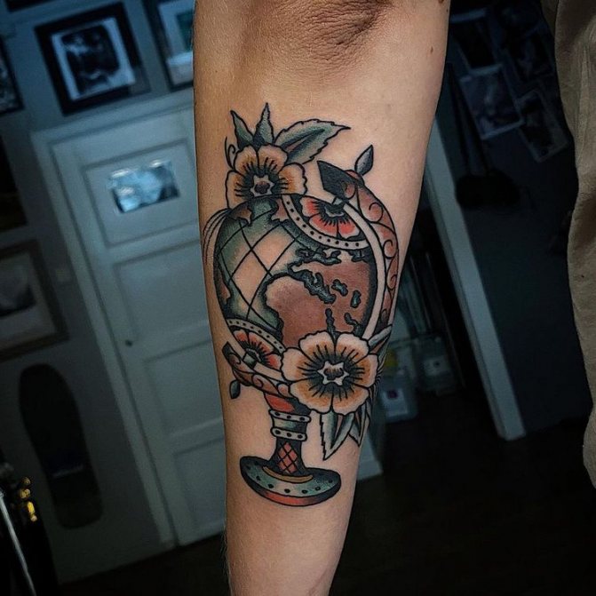 Obraz zeměkoule, stuha s mottem o lásce k cestování - znamení člověka milujícího svobodu, pro kterého nezáleží na ceně letenek a dostupnosti pohodlí na cestách. Hlavní věc pro majitele tetování - možnost vidět na vlastní oči legendární památky architektury a historie, exotické krajiny jiných zemí, úžasné krajiny vytvořené samotnou přírodou. Takoví muži získávají sílu a inspiraci z cestování, prožívají zážitky a uchovávají si krásné vzpomínky na každou cestu.