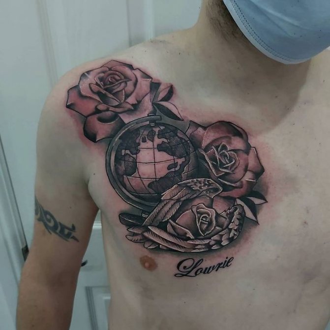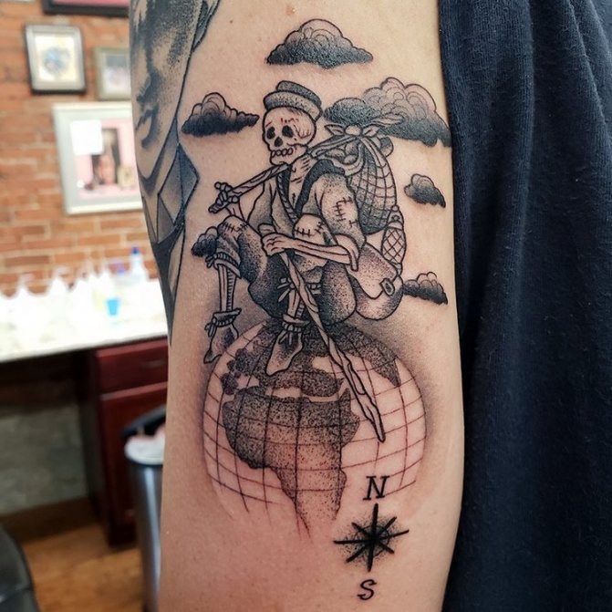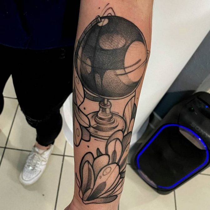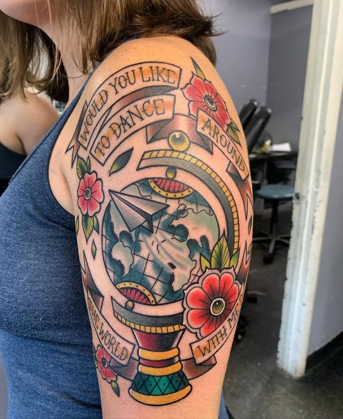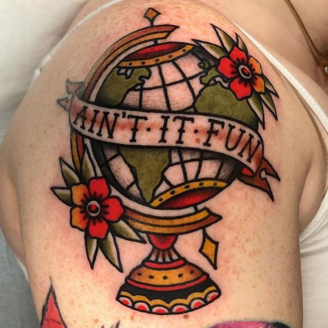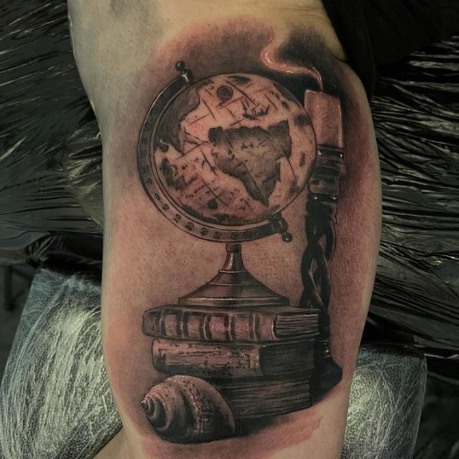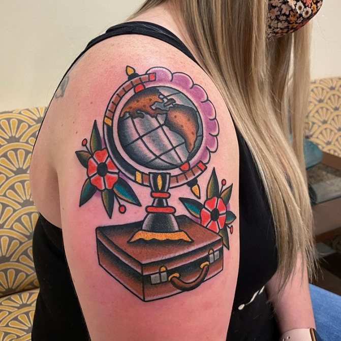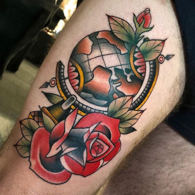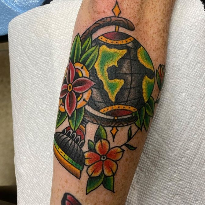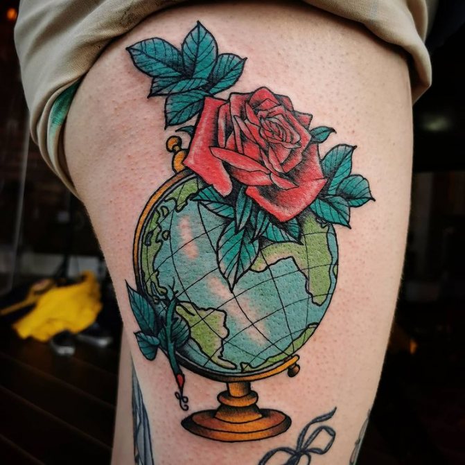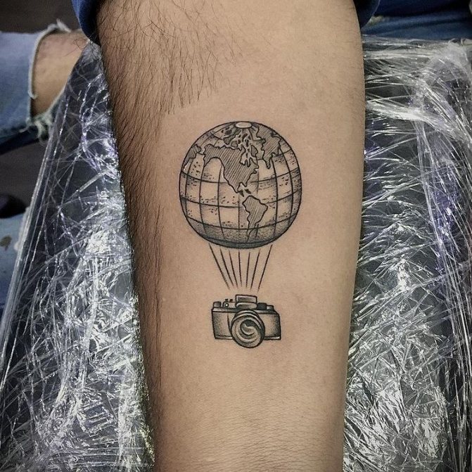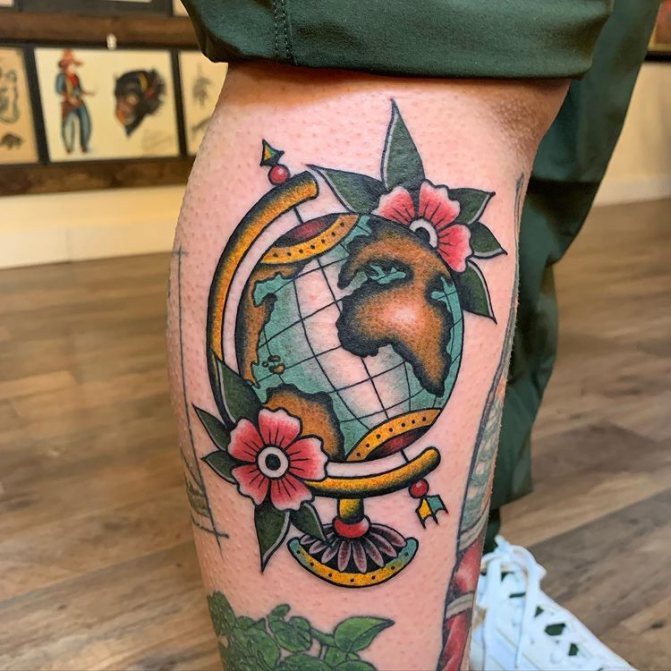 Obraz zeměkoule, stuha s mottem o lásce k cestování - znamení člověka milujícího svobodu, pro kterého nezáleží na ceně letenek a dostupnosti pohodlí na cestách. Hlavní věc pro majitele tetování - možnost vidět na vlastní oči legendární památky architektury a historie, exotické krajiny jiných zemí, úžasné krajiny vytvořené samotnou přírodou. Takoví muži získávají sílu a inspiraci z cestování, prožívají zážitky a uchovávají si krásné vzpomínky na každou cestu.