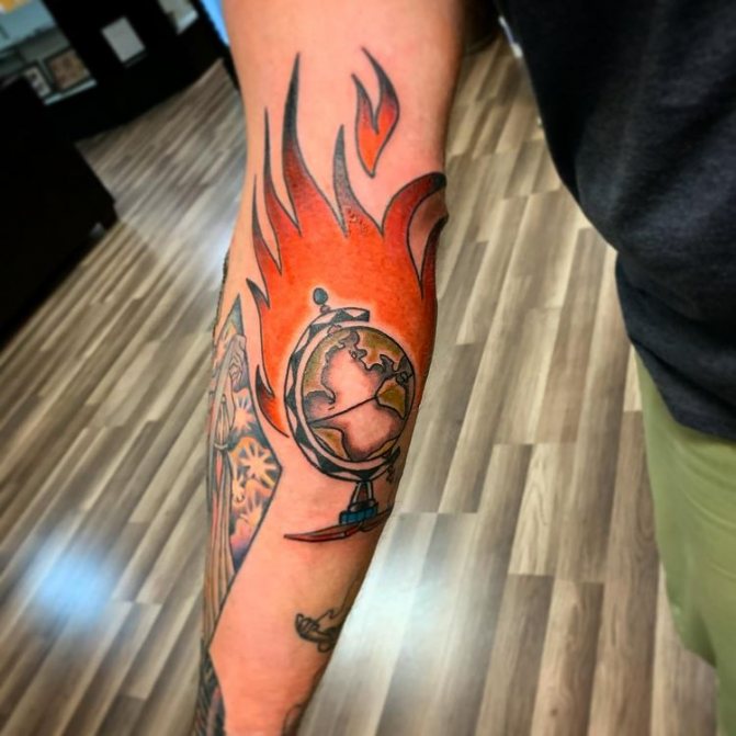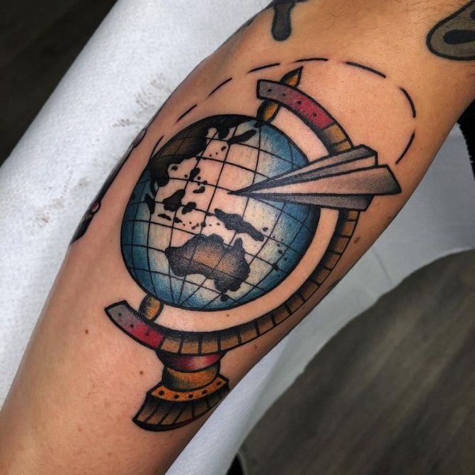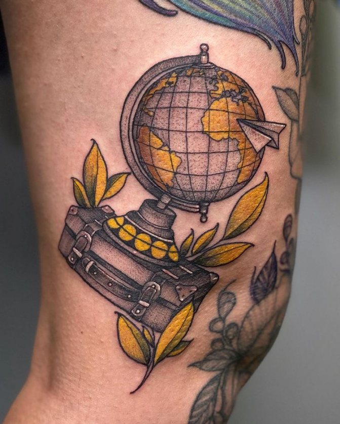 Kresba na těle, na níž je zobrazeno vozidlo spolu s globusem, odráží zájem nositele o cestování po světě, dlouhé cesty a lásku k cestování. Muži - majitelé tetování s autem nebo jízdním kolem na povrchu zeměkoule rádi plánují své vlastní cestovní trasy, tráví dovolenou a dovolenou na nových a krásných místech. Letadlo v tetování je symbolem leteckého cestovatele, milovníka letu a rychlosti.