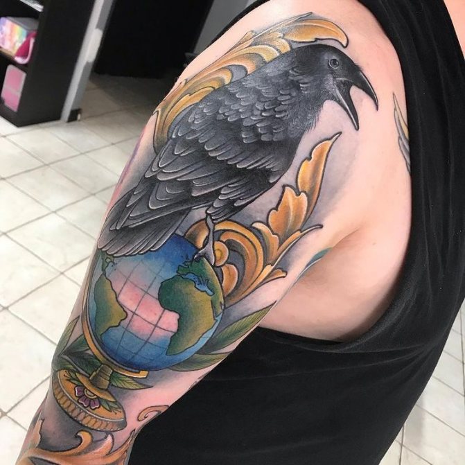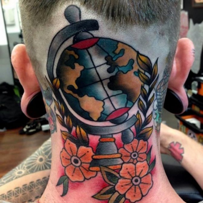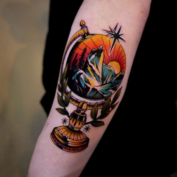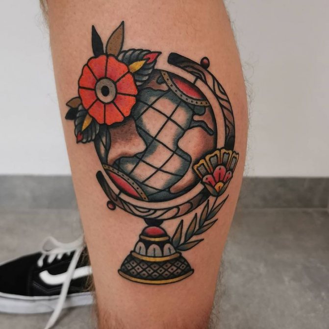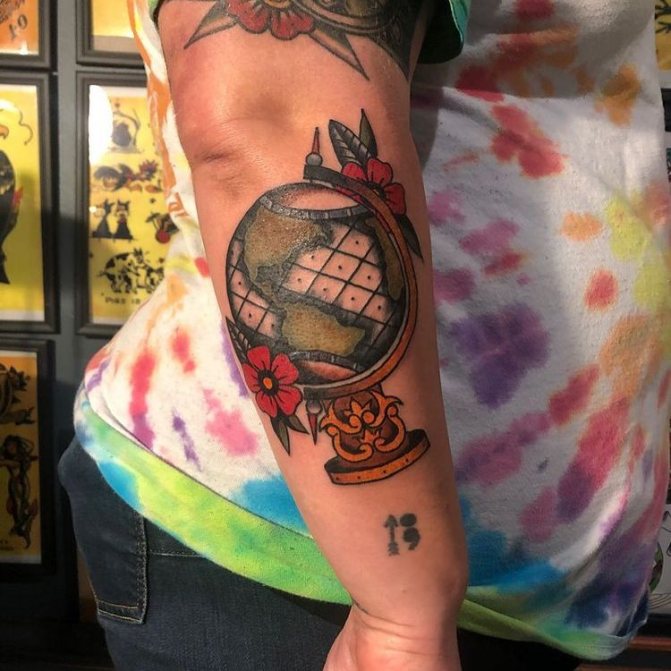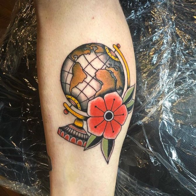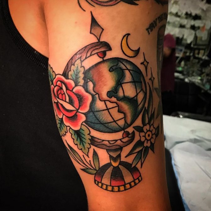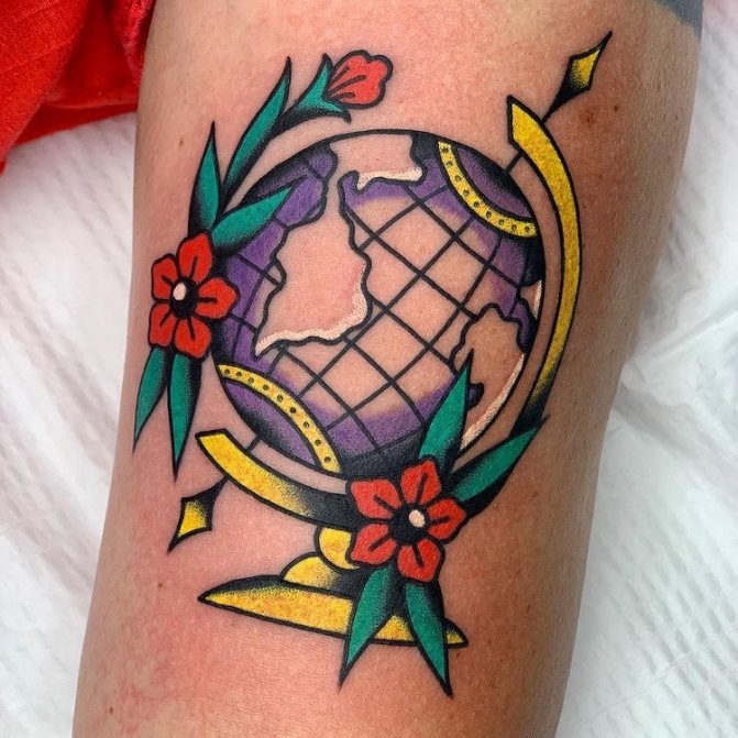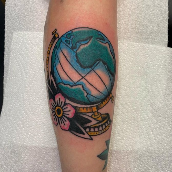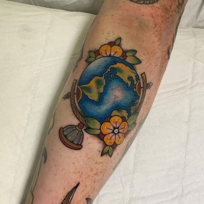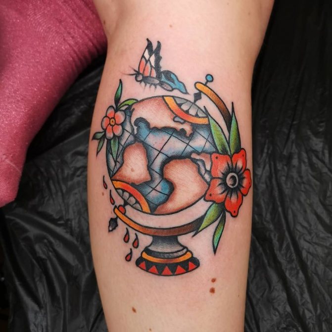 Barevné tetování, na kterém je zeměkoule někdy zobrazena jako jasná vizuální pomůcka pro děti, označuje pozitivní postoj majitele, optimismus a touhu dozvědět se o světě co nejvíce. Muž s živým vyobrazením modelu Země na těle je zvídavý a společenský, rád cestuje a navazuje nové známosti v různých zemích. Lidé si na tetování často vyznačují svá nejpamátnější města nebo země, aby si uchovali čerstvé dojmy.