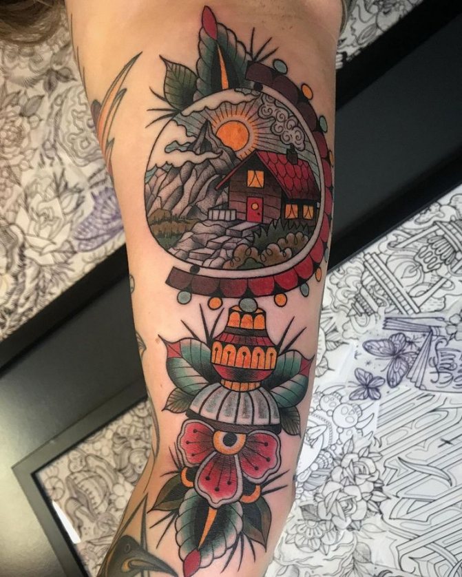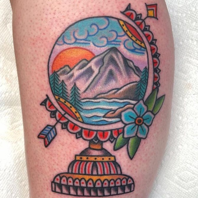 Tetování využívá myšlenku tvaru zeměkoule, přičemž místo zeměkoule je nositelem obrázku příroda, chata v lese, hory, palmy nebo jiná významná místa. Může vyjadřovat jak určitou lásku k turistice, tak symbolizovat city k domovu, kde člověk vyrůstal.