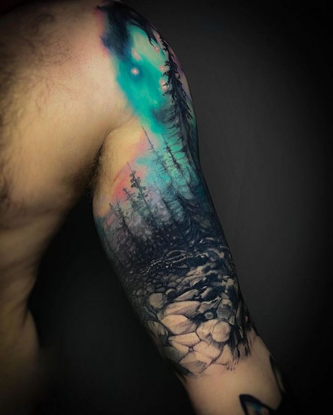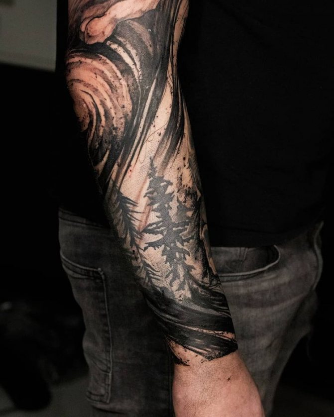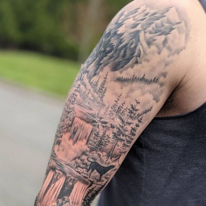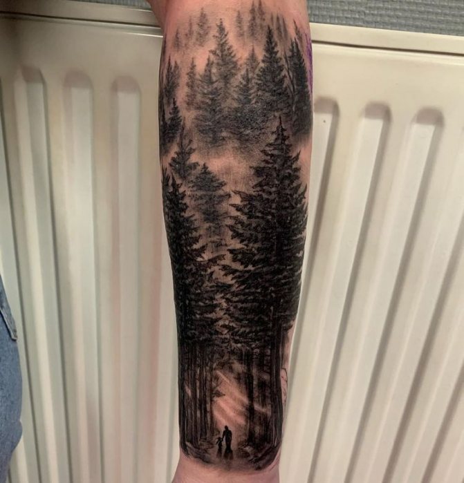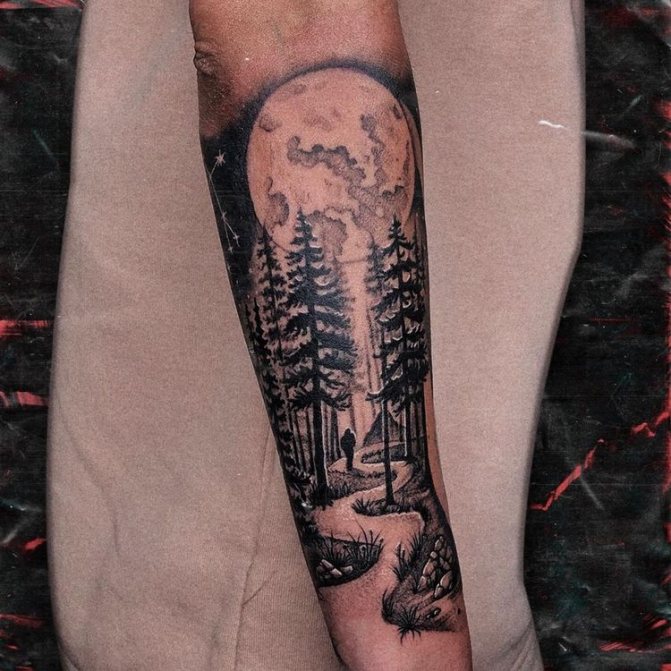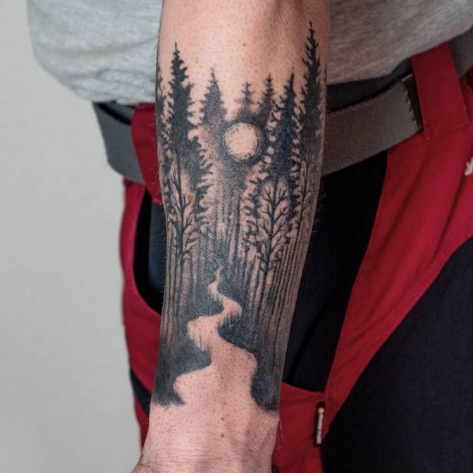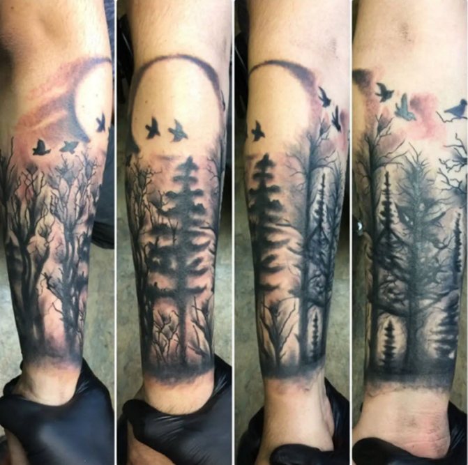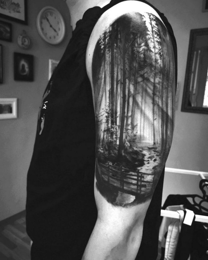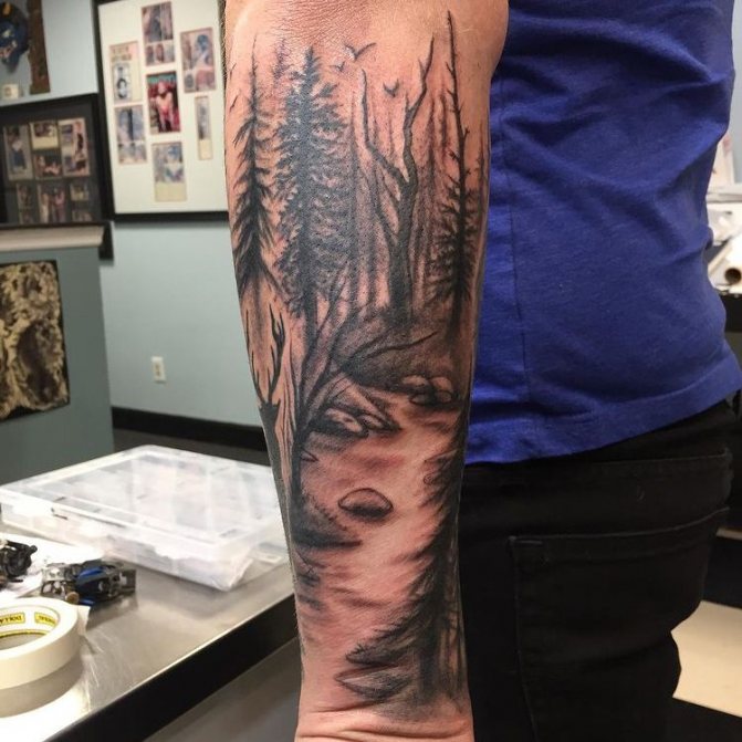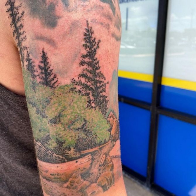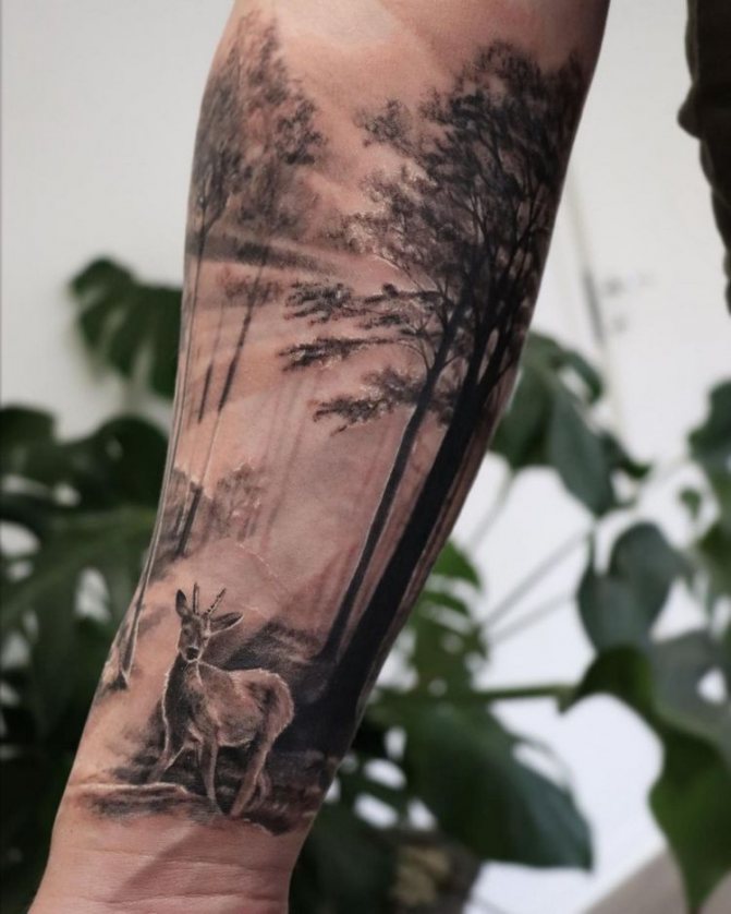 Obraz lesa je obtížné zmenšit. Velká krajina vypadá nejlépe na zádech, hrudi nebo bocích. Tetování rukávu také vypadá zajímavě - je to zajímavá kresba příběhu celé paže (od ramene k zápěstí, ale můžete udělat obrázek v menším měřítku), holistická a poměrně často se provádí na obou rukou. Spojením těchto dvou nezávislých částí vznikne nový obraz.