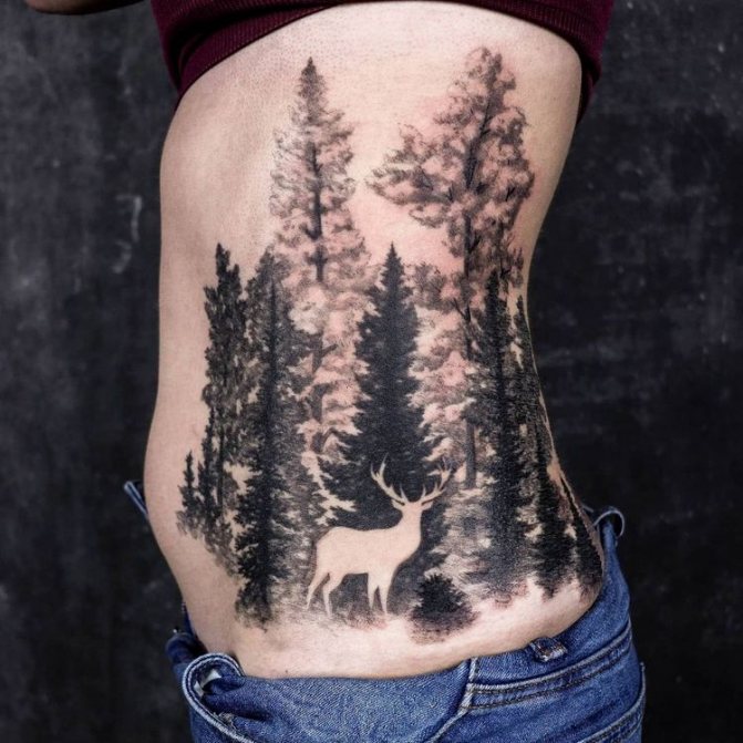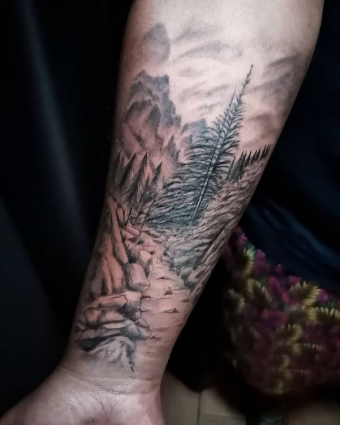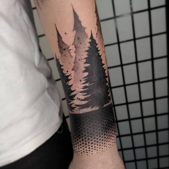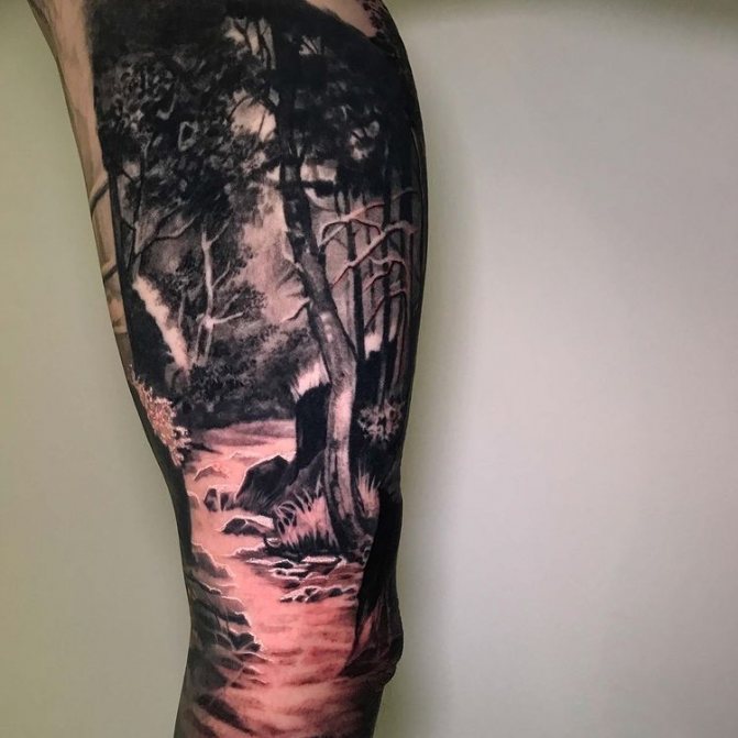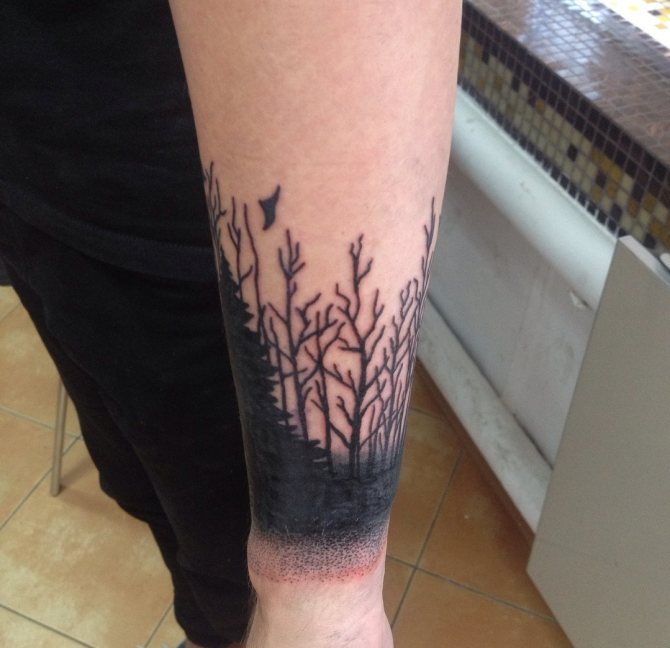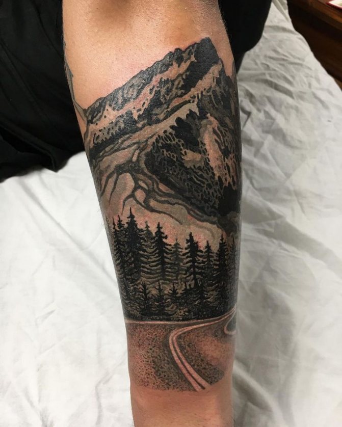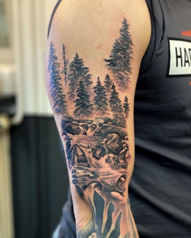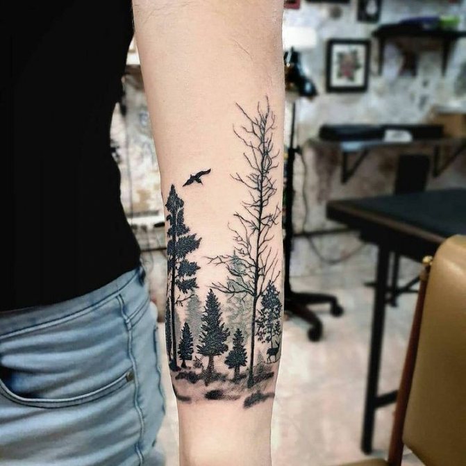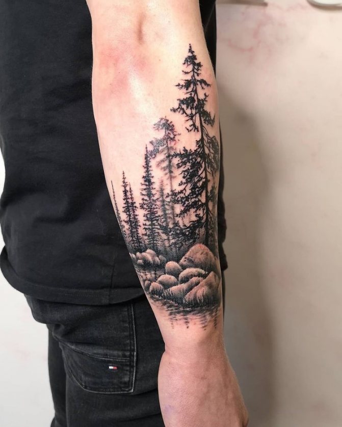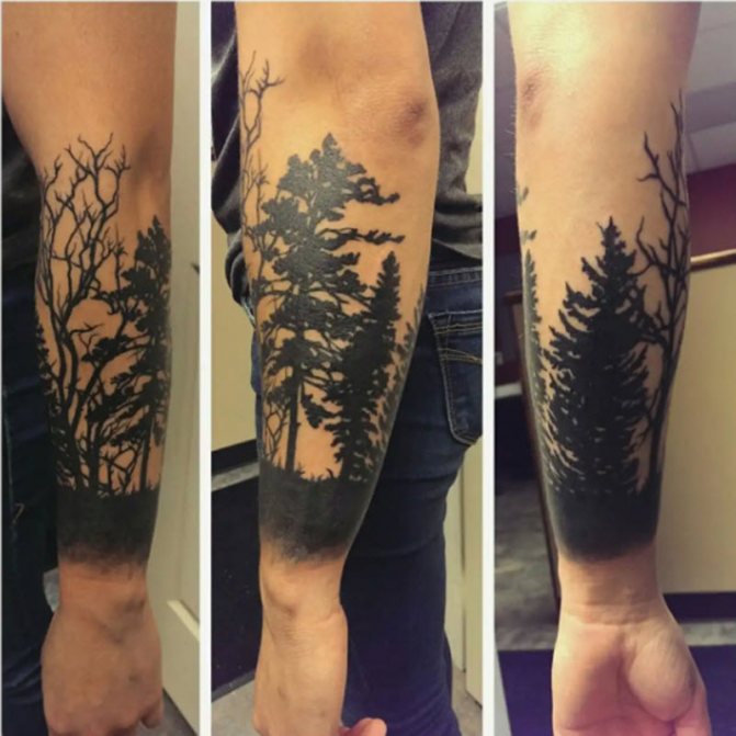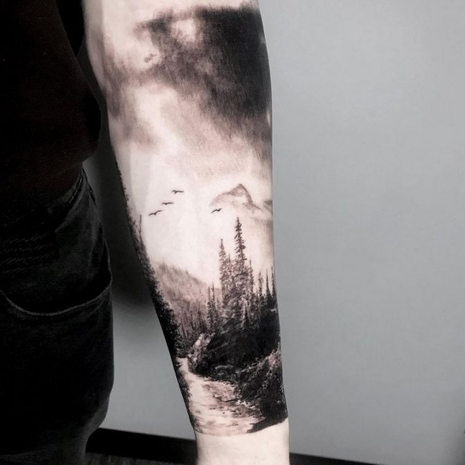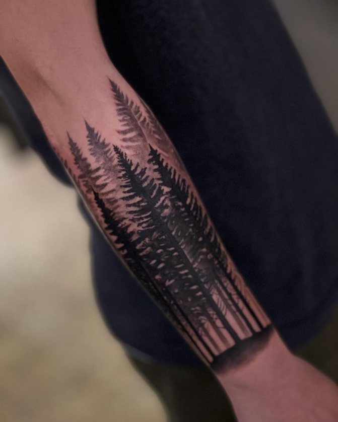 Obraz lesa je obtížné zmenšit. Velká krajina vypadá nejlépe na zádech, hrudi nebo bocích. Tetování rukávu také vypadá zajímavě - je to zajímavá kresba příběhu celé paže (od ramene k zápěstí, ale můžete udělat obrázek v menším měřítku), holistická a poměrně často se provádí na obou rukou. Spojením těchto dvou nezávislých částí vznikne nový obraz.