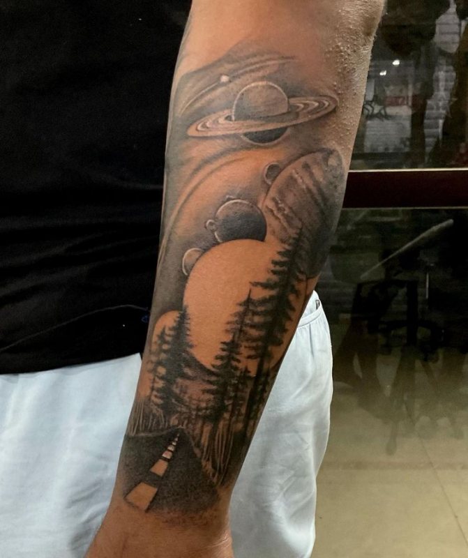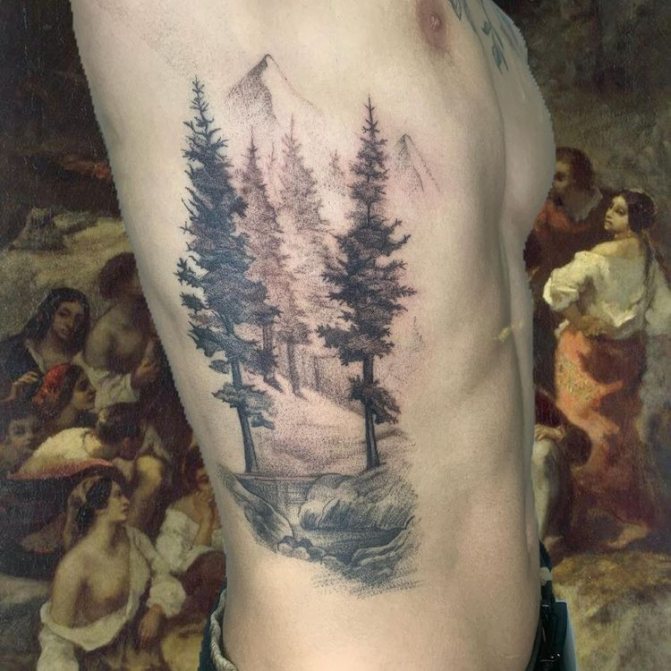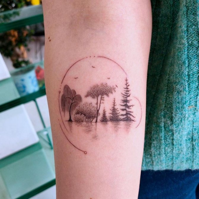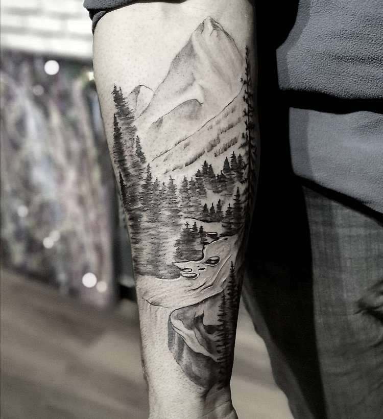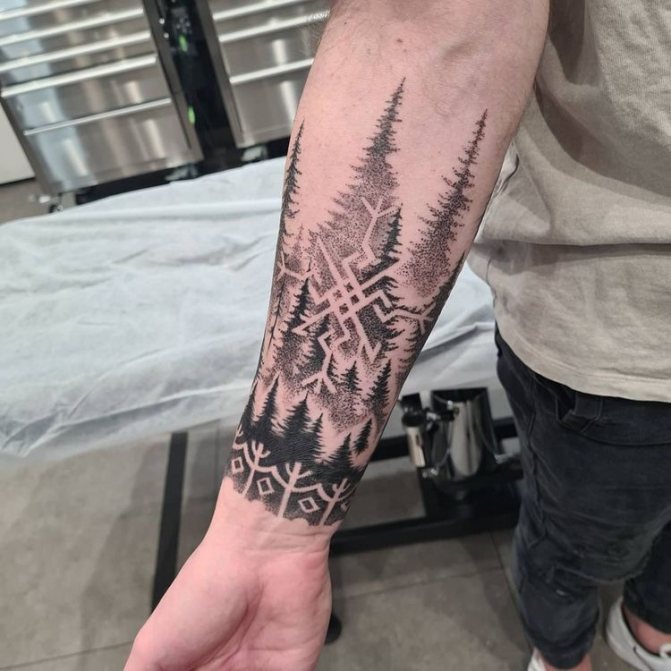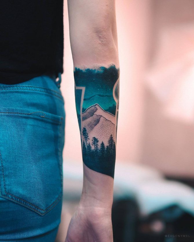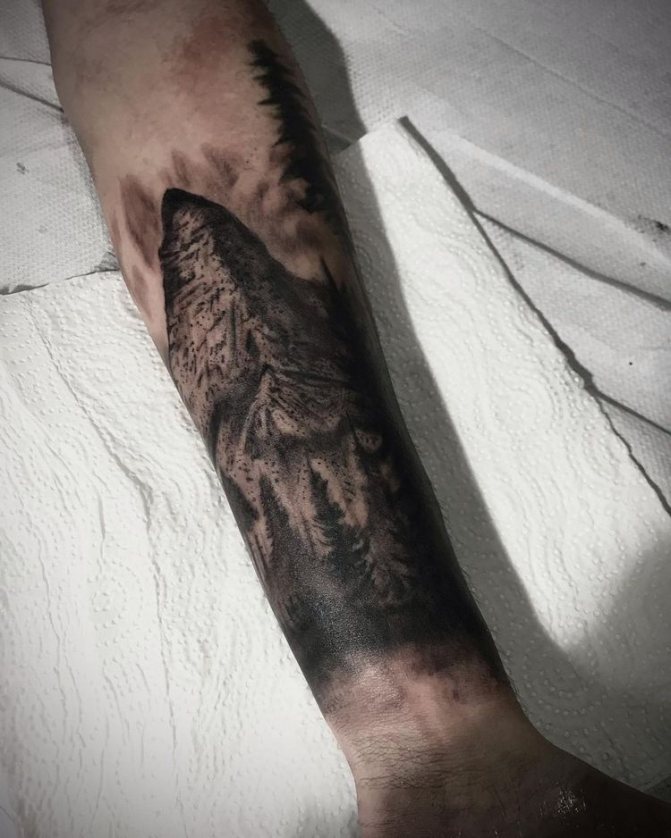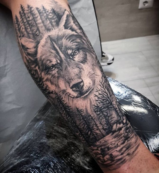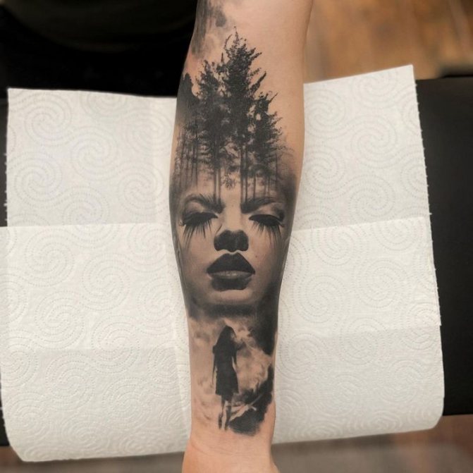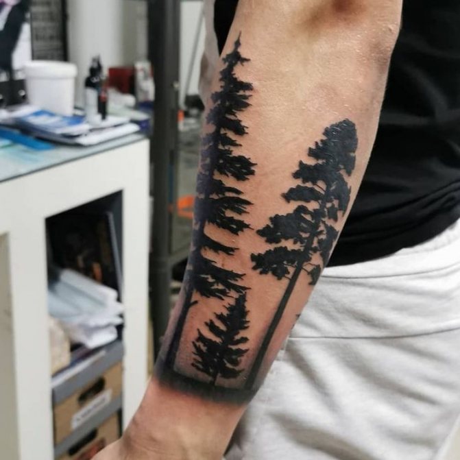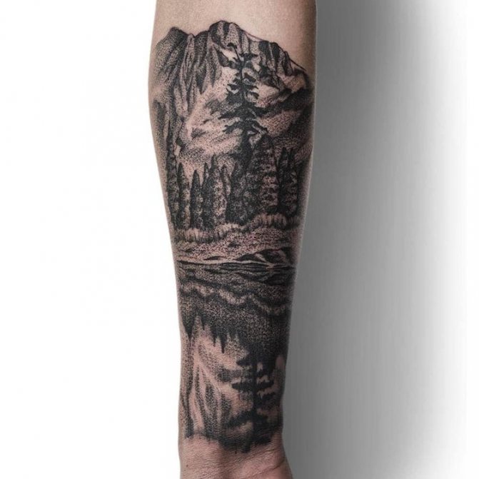 Obraz lesa je obtížné zmenšit. Velká krajina vypadá nejlépe na zádech, hrudi nebo bocích. Tetování rukávu také vypadá zajímavě - je to zajímavá kresba příběhu celé paže (od ramene k zápěstí, ale můžete udělat obrázek v menším měřítku), holistická a poměrně často se provádí na obou rukou. Spojením těchto dvou nezávislých částí vznikne nový obraz.