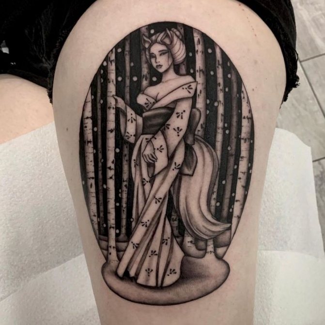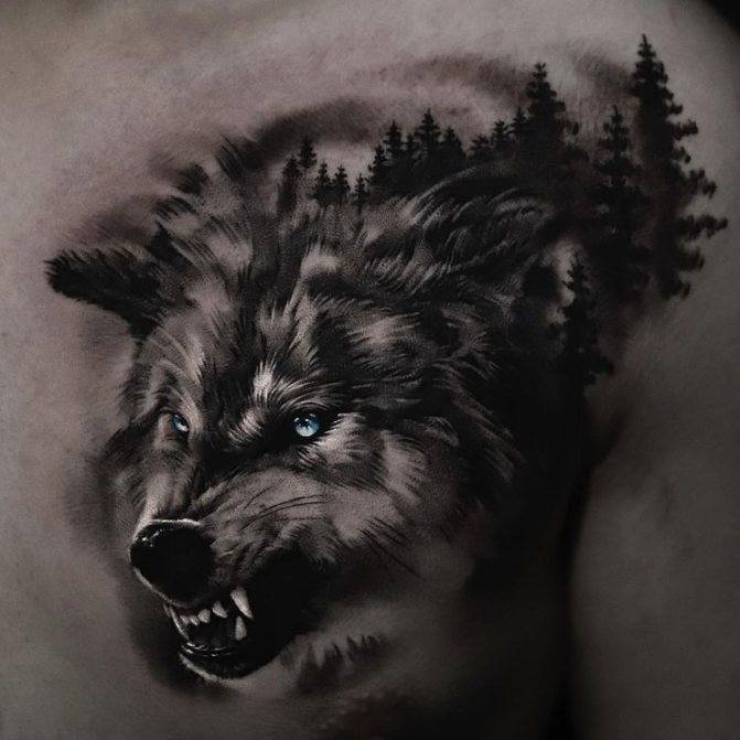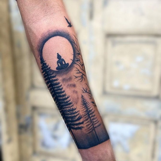 Tajemná atmosféra obklopuje majitele tetování měsíčním hájem, zejména pokud provedete obrázek ve stylu realismu. Nepřehlédnutelná tma lesa a jeho světlem zalitý celý měsíc - jako symbol dobré víry v budoucnost, naděje na záchranu, příchod šťastných událostí. Kromě toho je důležitý cyklus zobrazeného měsíce (zrození, život, zánik): úplněk je nejčastější v kombinaci s lesem. Kruh dokonalého tvaru: na jedné straně představuje celistvost, duchovní sílu, na straně druhé pomíjivost života, jeho nestálost.