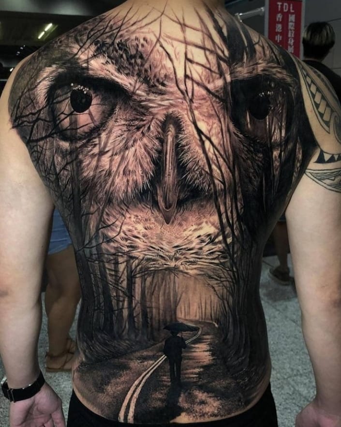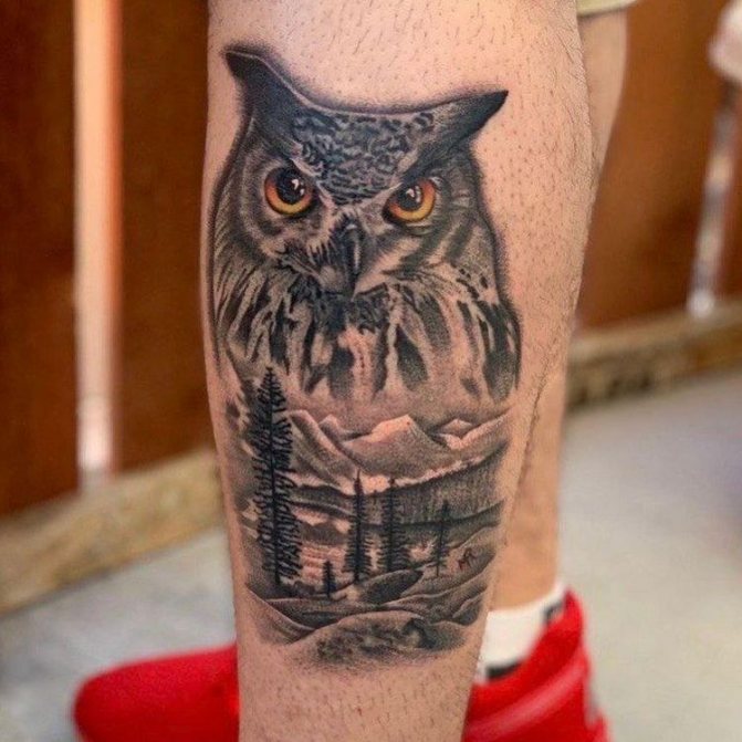Sova představuje moudrost, zvědavost a nebezpečí, vypovídá o pozornosti a obezřetnosti nositele tetování. Sova je vyobrazena na pozadí hustého háje a stává se znamením, že nositel tetování našel své místo ve světě.