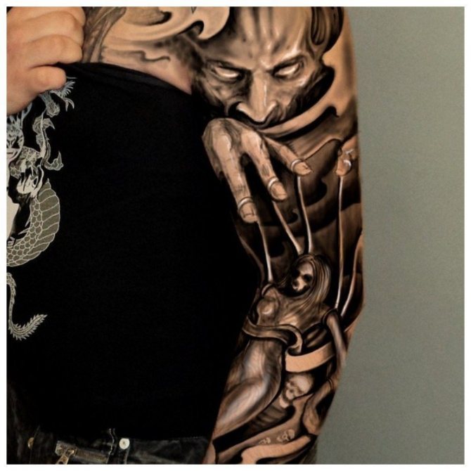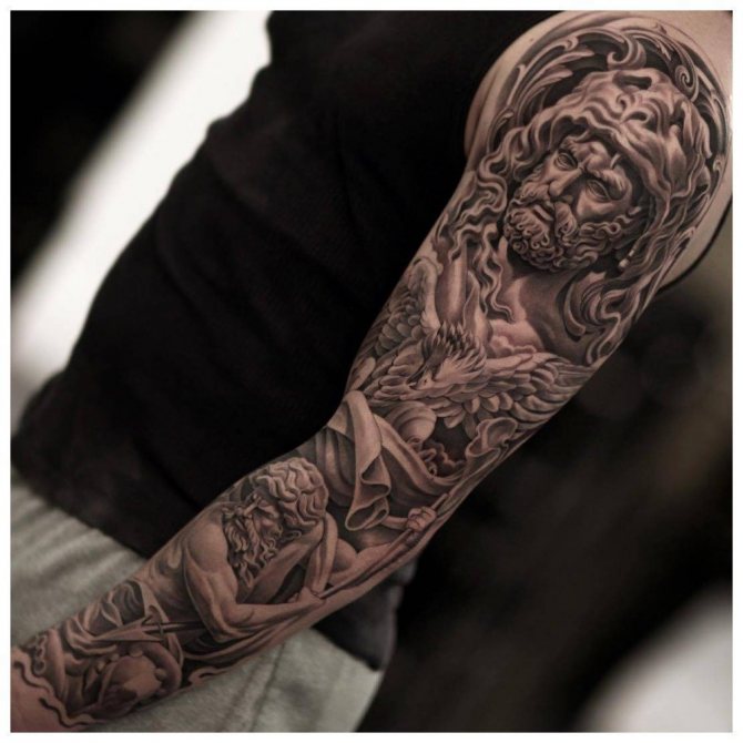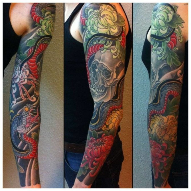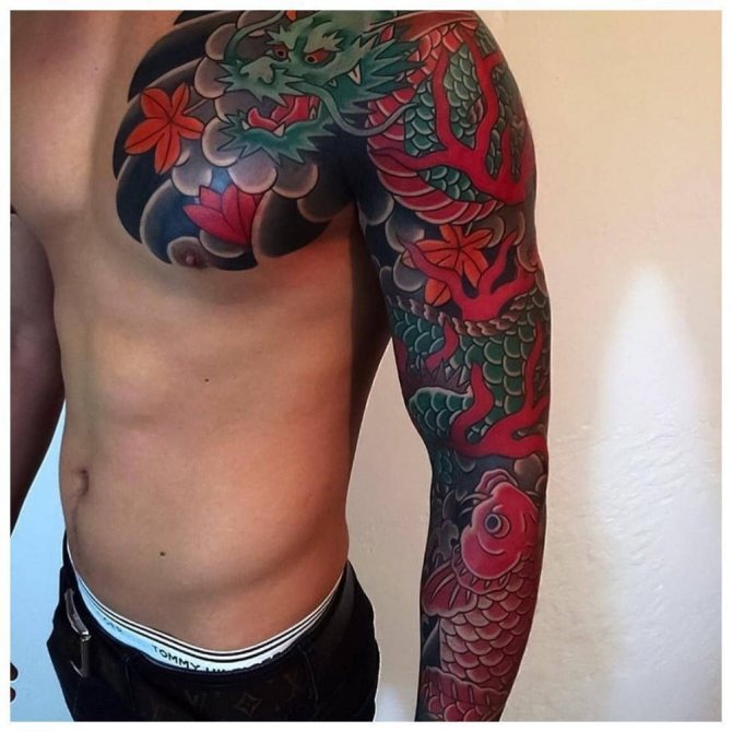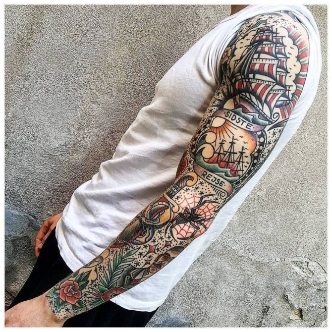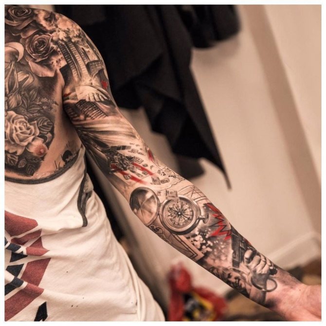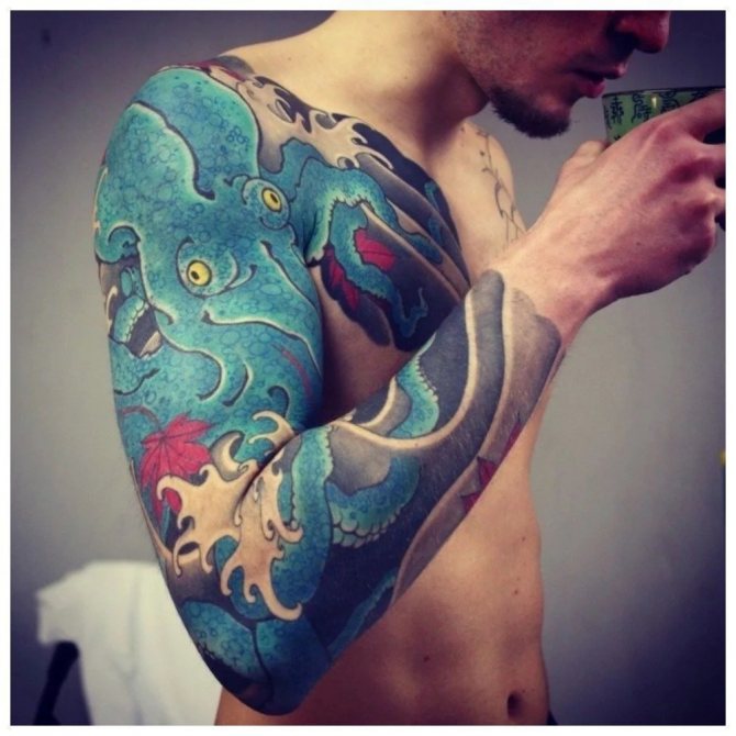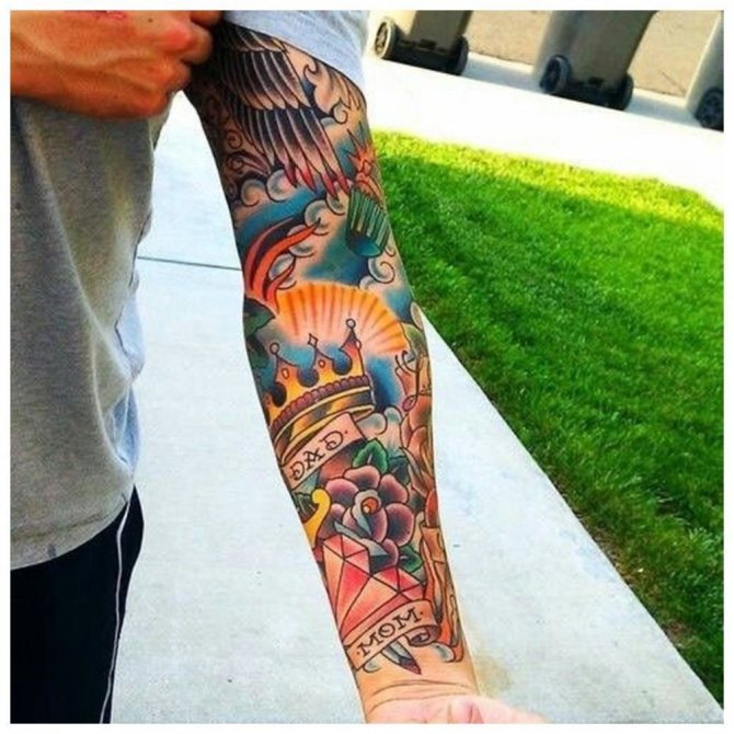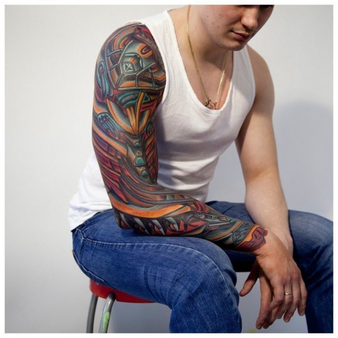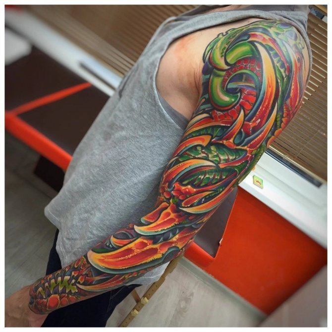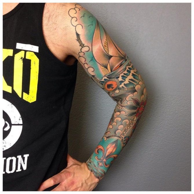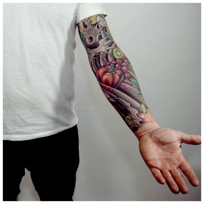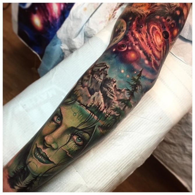 Ti, kdo si myslí, že pohledný mužský "rukáv" až k lokti musí být nutně černobílý, prostě neviděli parádní barevné vzory. Barevná tetování na celé ruce jsou provedena technikou akvarelu nebo realismu.