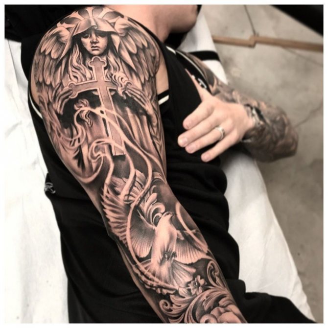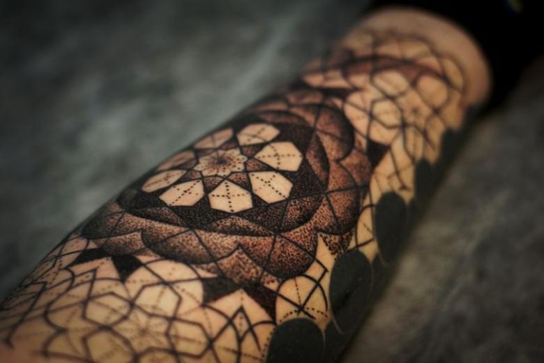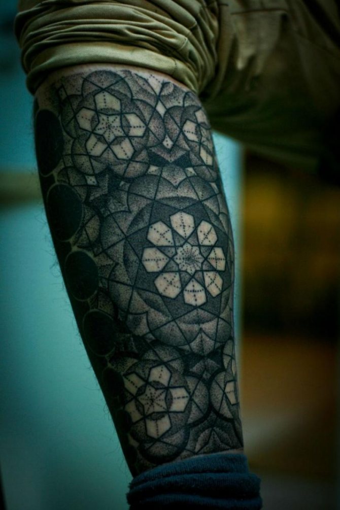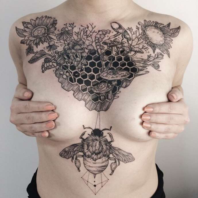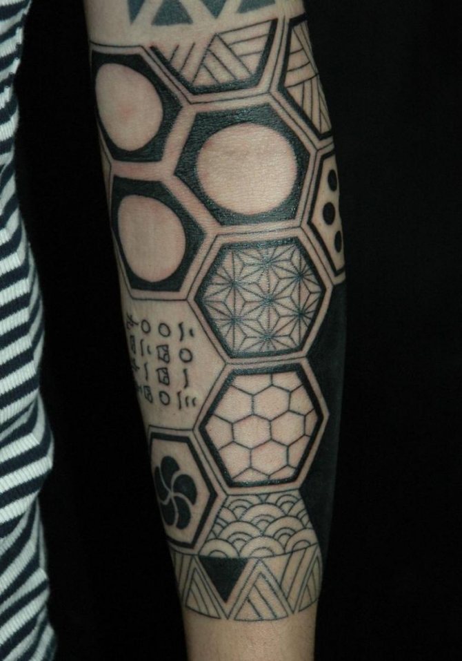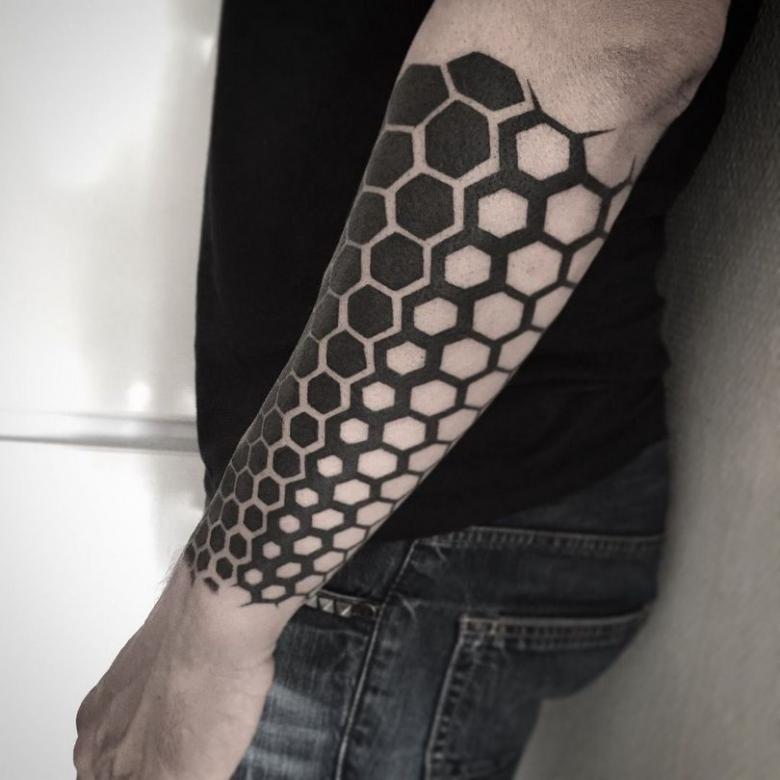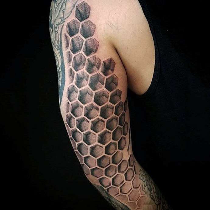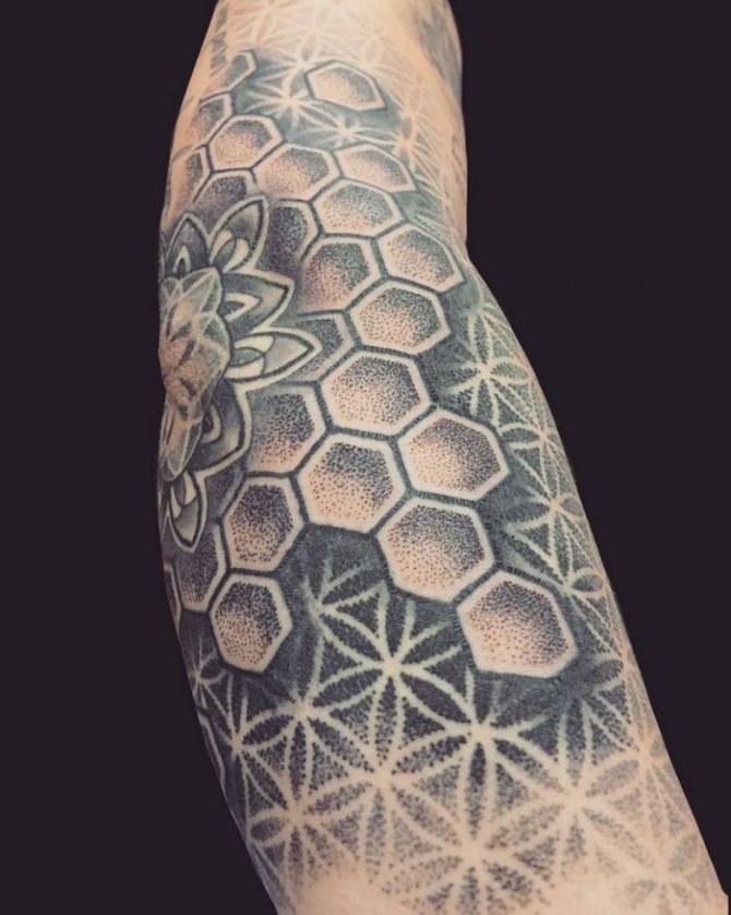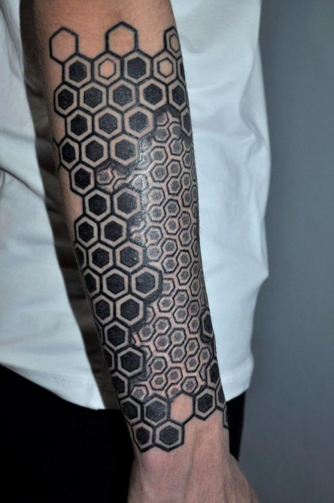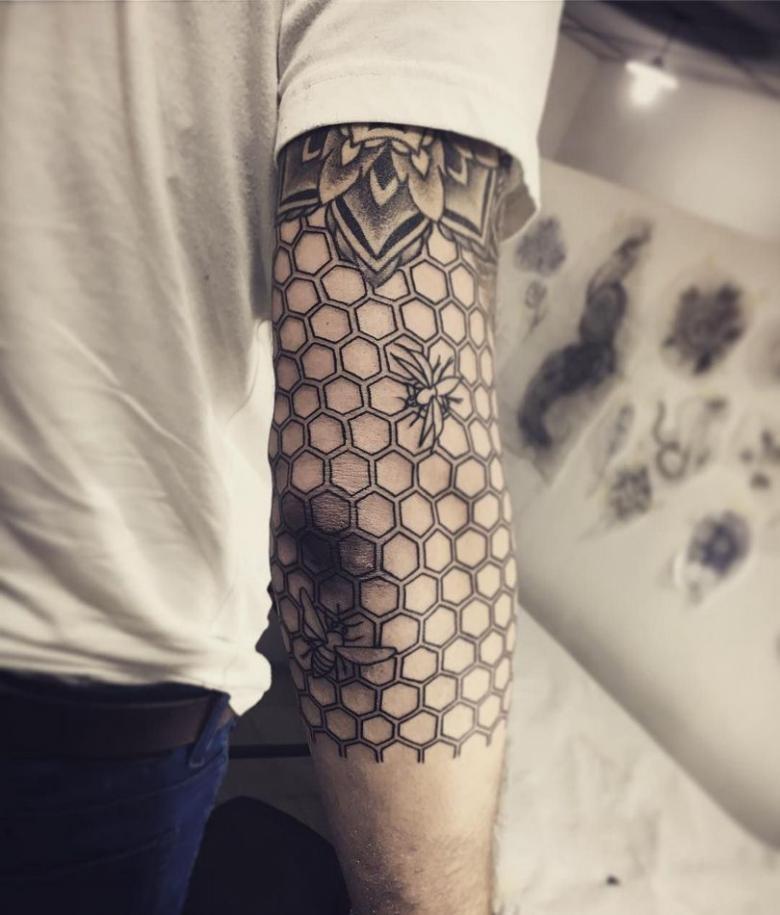 Tetování na rukávu ve tvaru včelí plástve v jednobarevné verzi vypadá ve stylu Dotwork velkolepě. Skica se na tělo nanáší pomocí mnoha malých bodů, z nichž se obraz stává vypouklým a objemovým. Ti, kteří mají rádi obrázky co nejpodobnější originálu, si mohou vybrat pouzdro ve stylu realismu. Složení lze ozdobit přímo včelami. Tetování ve tvaru černé kružby se často používá jako krytí starého tetování, takže šestiúhelníkový design je skvělou alternativou k unavenému obrázku. Takové tetování může být součástí větší kompozice a kombinováno s libovolnými prvky.