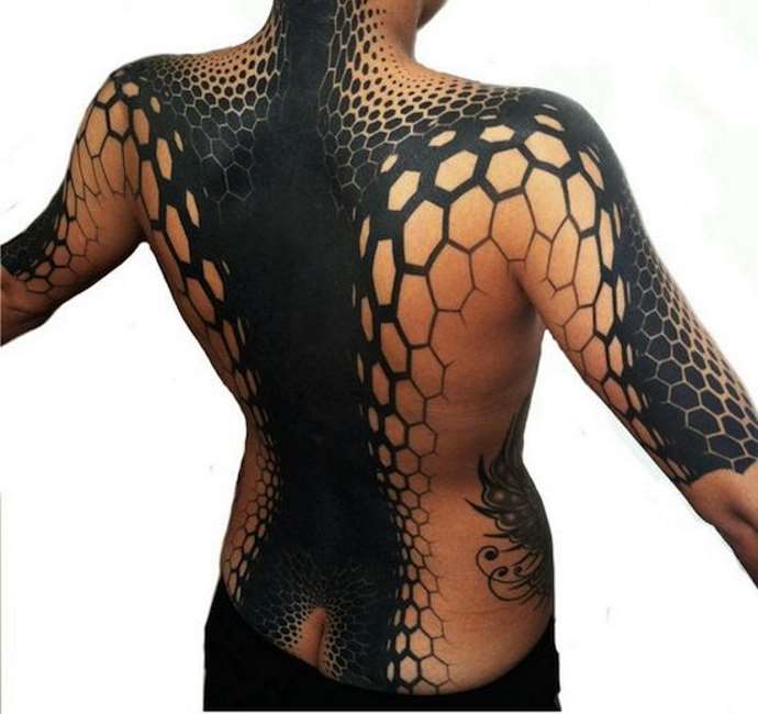 Existují černé a bílé verze tetování včelích úlů. Není těžké odhadnout, že největší účinek bude mít celoplošný obrázek s velkým počtem buněk. Nejlépe vypadá barevný obrázek s neobvyklým barevným pozadím.
