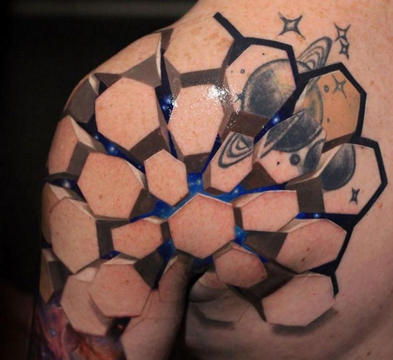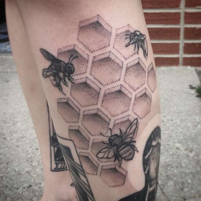 Včelí plástev láká milovníky tetování svým jasným geometrickým tvarem. Bezvadný šestiúhelníkový tvar jako by sliboval řád, klid a spolehlivost v životě.