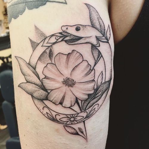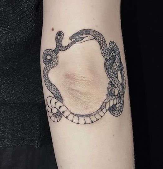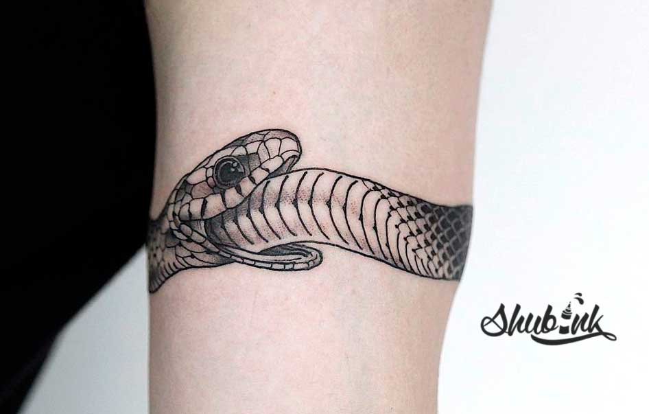 Tetování s hadem ovinutým kolem ramene nebo předloktí vypadá na ženské paži obzvlášť elegantně a zvyšuje eleganci obrázku. Potisk na paži mužského člena zvýrazní sílu mužské končetiny. Předloktí je velmi velká plocha a práce na návrhu bude téměř bezbolestná.