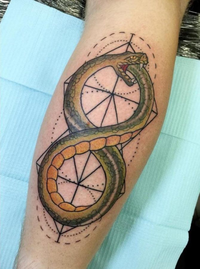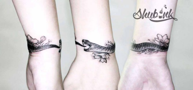 Ilustrace s hadem obepínajícím zápěstí nebo kotník bude další energetickou ochranou. Pro dívky je to módní doplněk, který vypadá jasně a tajemně. Muži méně často tetují zápěstí a na vnější stranu dlaně umisťují kroužek s legendárním plazem nebo obrázek zahrnují do celkového děje rozsáhlého rukávu.