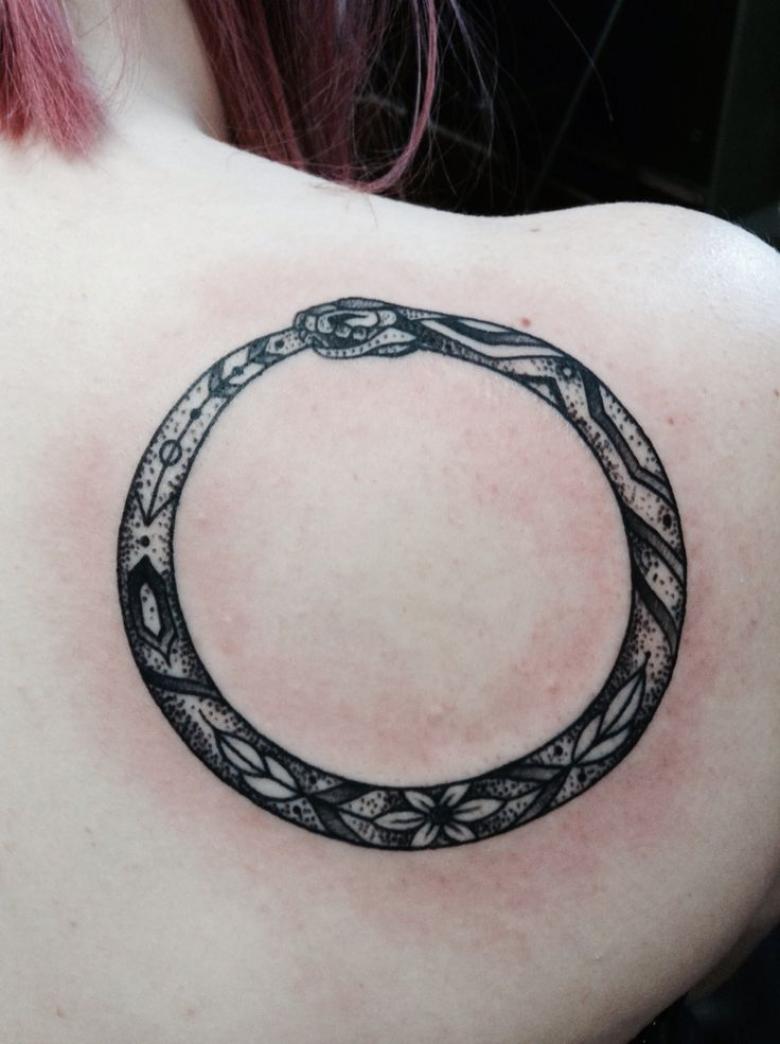 Zadní prostor je ideální pro velkoplošné tetování, místo pro symboly víry. Proto je tetování Ouroboros začleněno do většího uměleckého díla, ale antický znak je stejně přitažlivý i v samostatném provedení. Díky odolnosti pokožky vůči věkovým změnám si tajemné tetování zachová svůj působivý vzhled po dlouhou dobu.