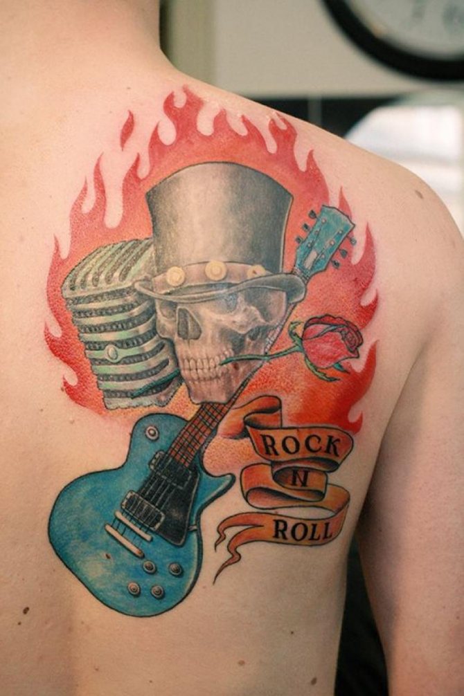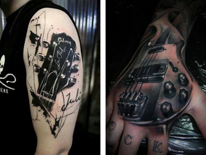 Proč ji nezobrazit na těle. Takové tetování rocková hudba Může hrát další roli, která označuje hlučného, dynamického člověka, nejen jeho povolání.