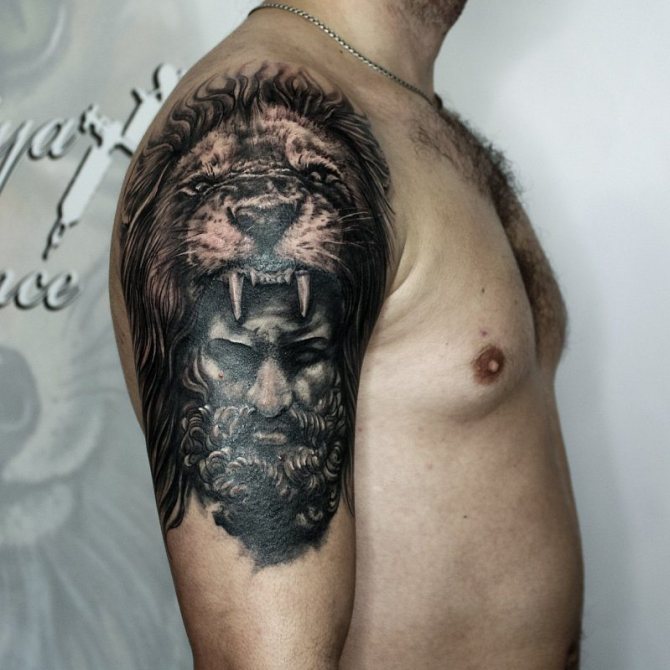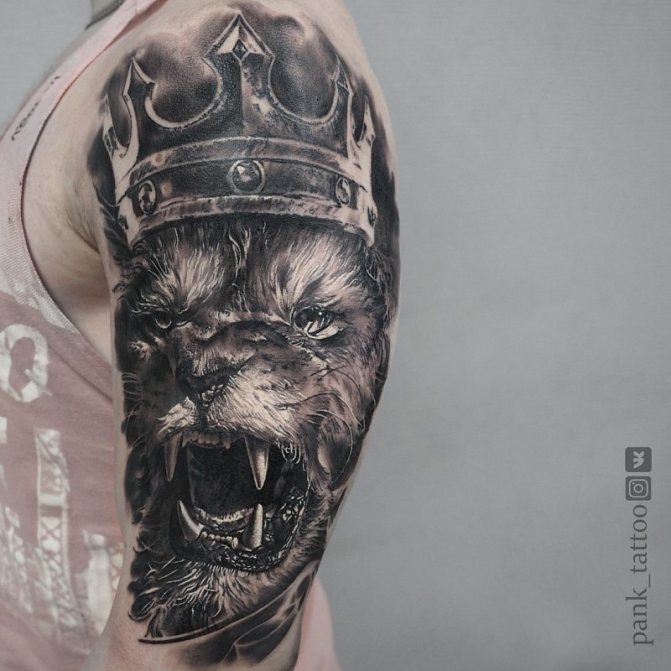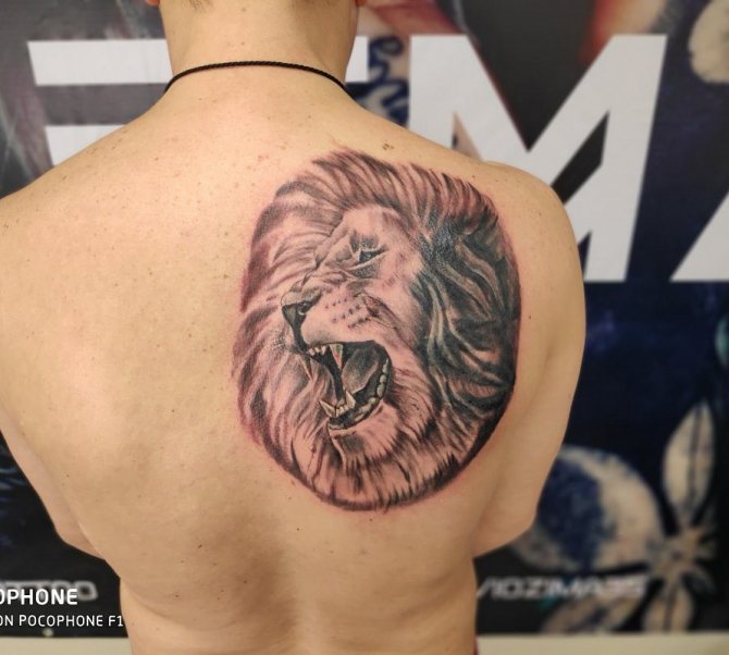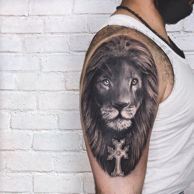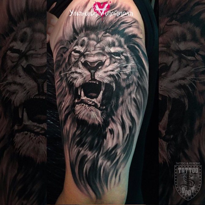 Tetování znamení zvěrokruhu lev na rameni naznačuje sílu charakteru a statečnost. Muž se lvem na rameni demonstruje svou nezávislost. Obrázek může zobrazovat agresivní zvíře s otevřenou tlamou nebo klidné zvíře v kombinaci s jinými zvířaty.