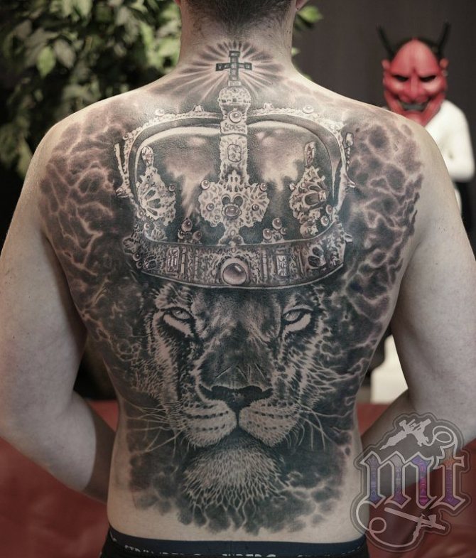 Lev na zádech nebo lopatkách symbolizuje vůdcovství. Člověk, který se rozhodne pro toto uspořádání, musí mít touhu vést a dokonce si podmanit ostatní lidi. Tetování na zádech je někdy koncipováno jako velkoplošné, vícebarevné tetování s dalšími prvky.